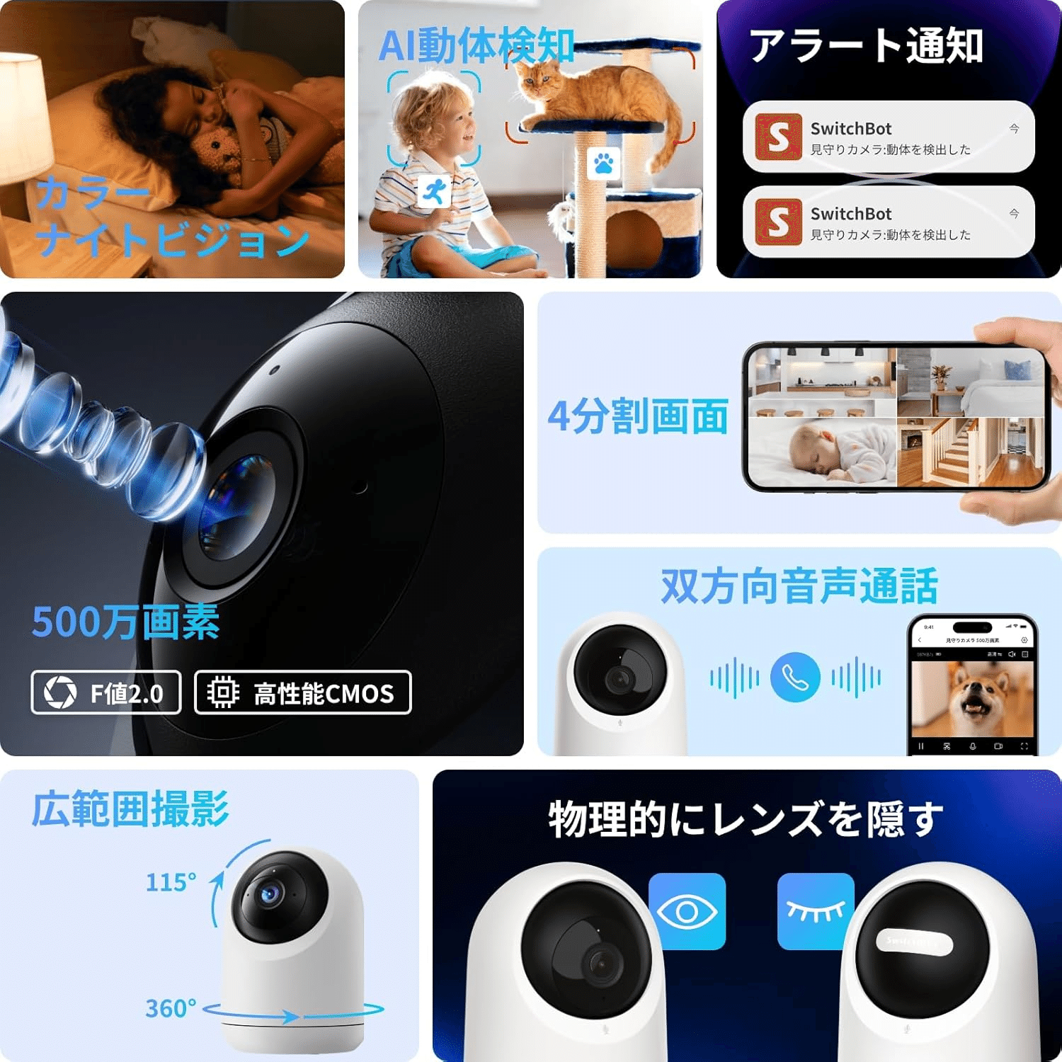 Title 【Works with Alexa認定】 SwitchBot 防犯カメラ 500万画素 監視カメラ アプリ通知 遠隔確認 動体検知 自動追跡 ナイトビジョン 双方向音声通話 パン/チルト カラーナイトビジョン 室内 スイッチボット 見守りカメラ Plus 5MP 3年保証