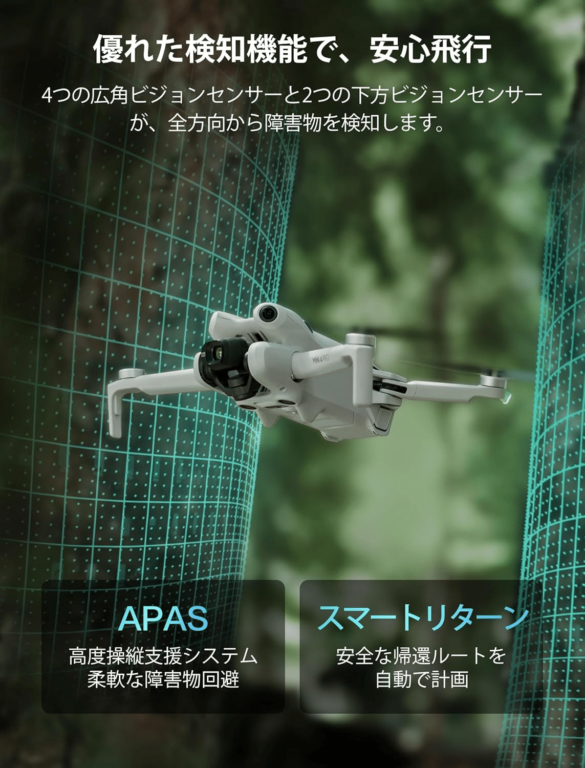 優れた検知機能で、安心飛行 – DJI Mini 4 Pro 4K対応折り畳みミニドローン