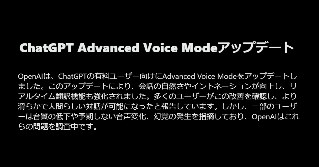 本記事の拡張版では、ChatGPTのAdvanced Voice Mode更新に関する詳細情報を提供しました。自然さや翻訳機能の向上はユーザー体験を大きく改善する一方で、音質や遅延に関する課題も存在します。OpenAIの継続的な改善努力により、これらの問題が解決され、より優れたAI対話体験が提供されることが期待されます。