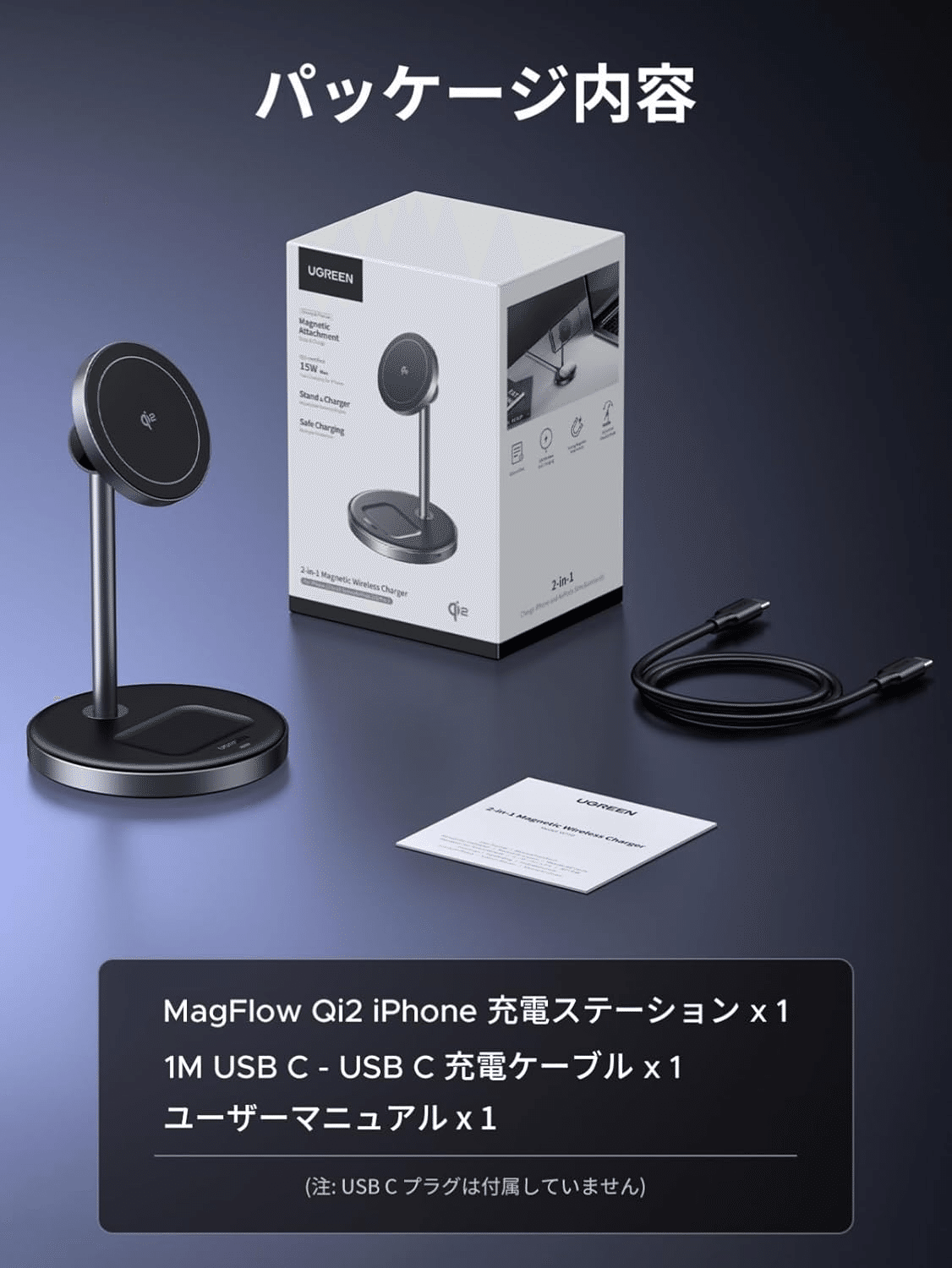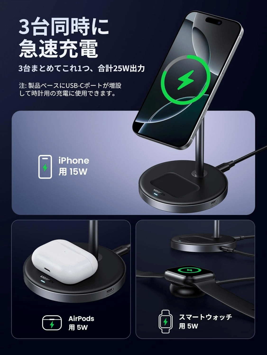 Title UGREEN MagFlow Qi2 ワイヤレス充電器 Magsafe 充電スタンド USB-Cポート拡張 3台同時 合計25W出力 置くだけ充電 マグセーフ 無線 角度調整可能 Phone 16/15/14/13/ 12/ mini/Pro/Pro Max, AirPods Pro/3/2/1,Apple Watchなど適用