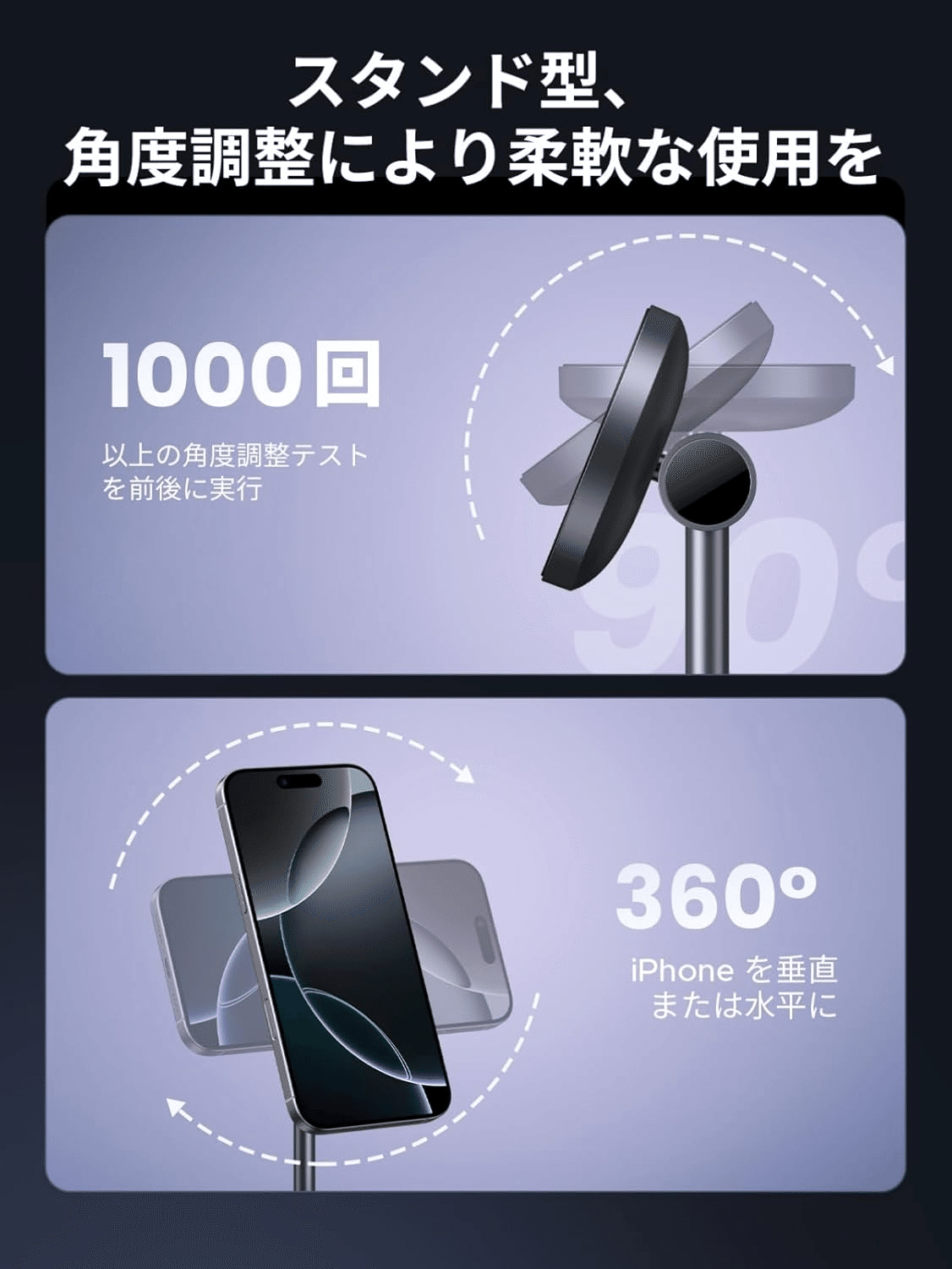 iPhoneとAirPodsを同時に充電できて、デスクがスッキリ。角度調整も使いやすい!