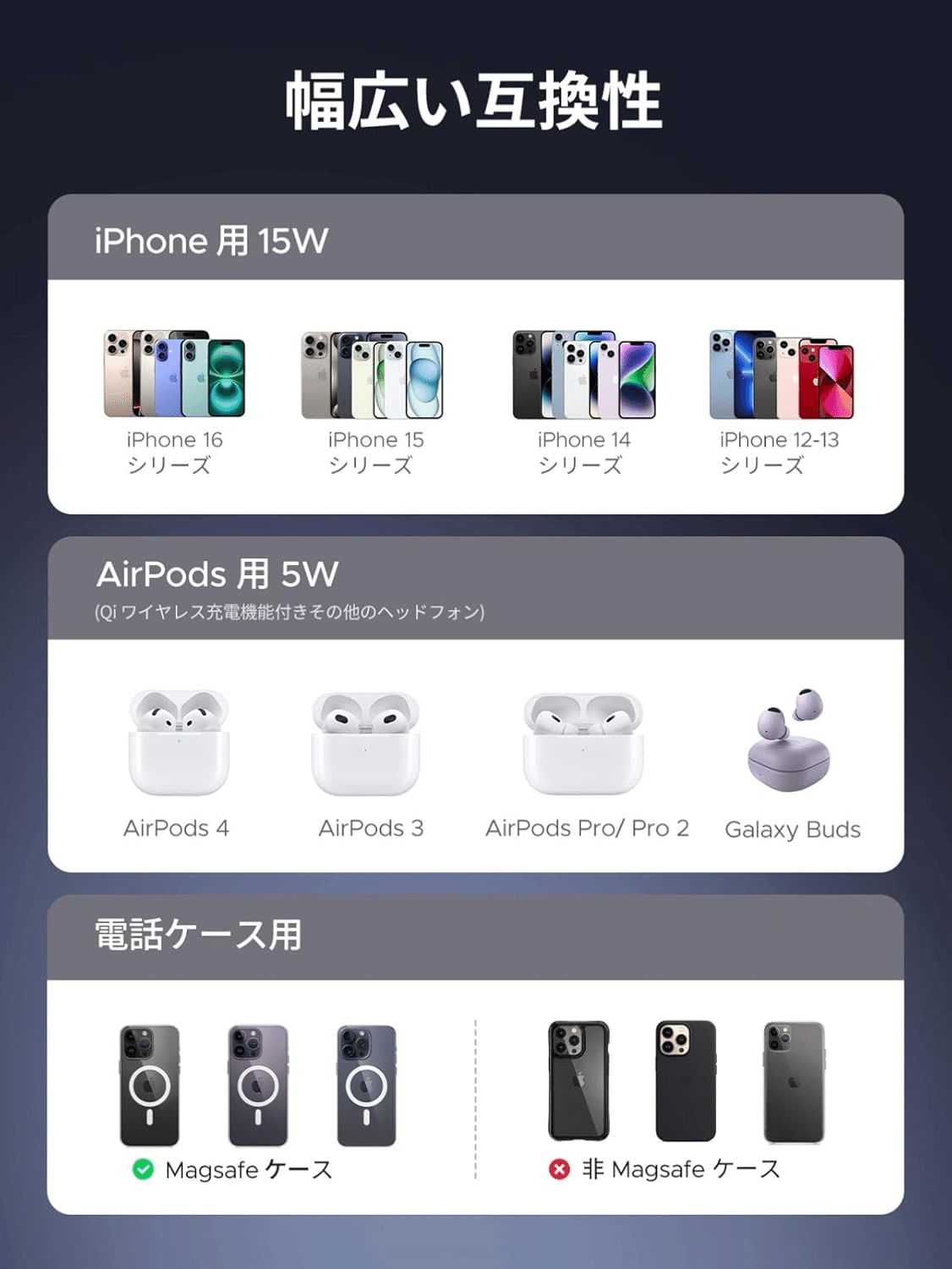 互換性: iPhone 16/15/14/13/12シリーズ