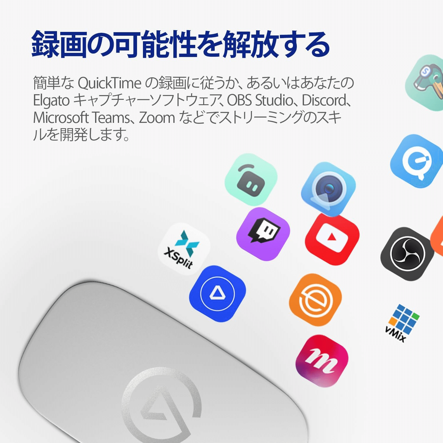 対応ソフトウェア: Elgato 4K Capture Utility、OBS Studio、QuickTime、Discord、Microsoft Teams、Zoom