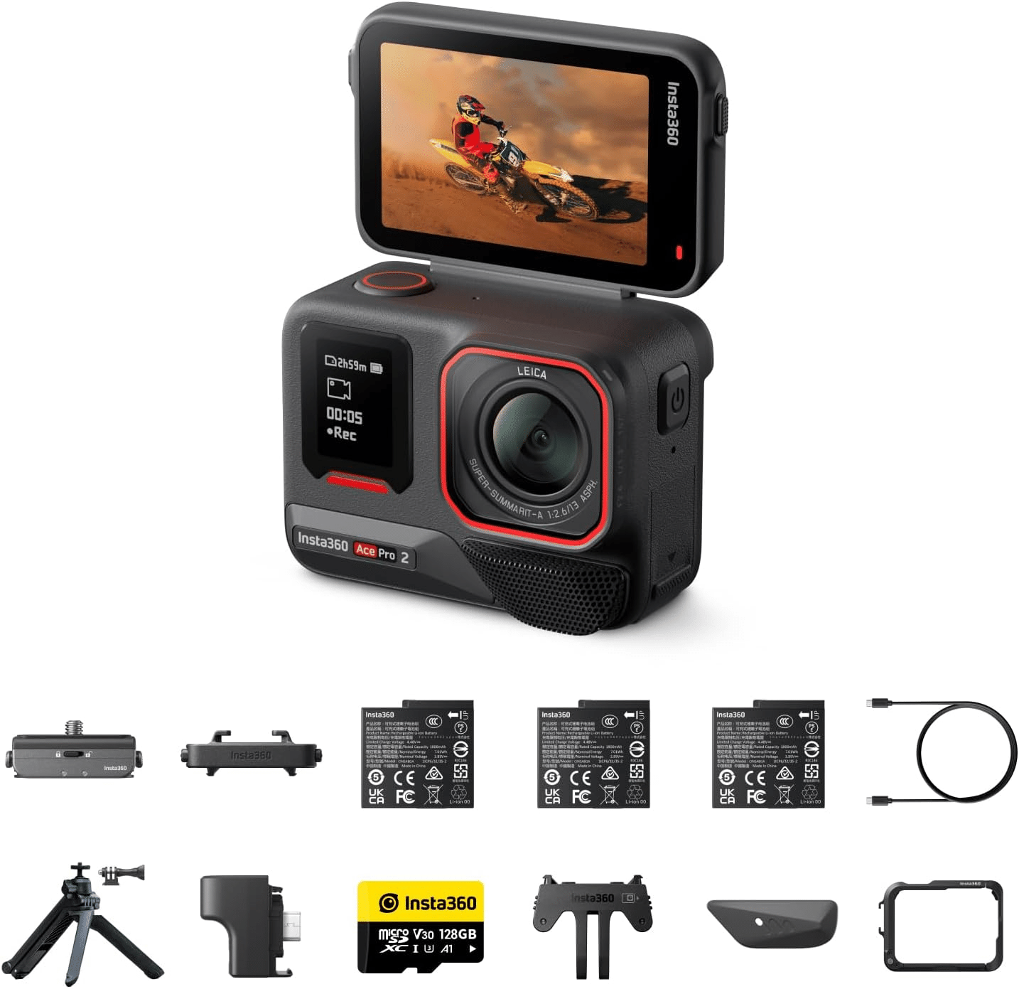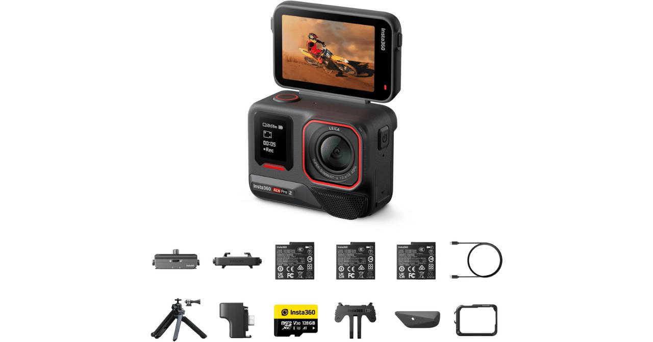 Title Insta360 Ace Pro 2 – デュアルバッテリー ライカとの共同開発による防水仕様の8Kアクションカメラ。1/1.3インチセンサー、デュアルAIチップ 暗所性能 オーディオ、フリップ式スクリーン&AI編集でVlogやオートバイなどに最適 究極キット