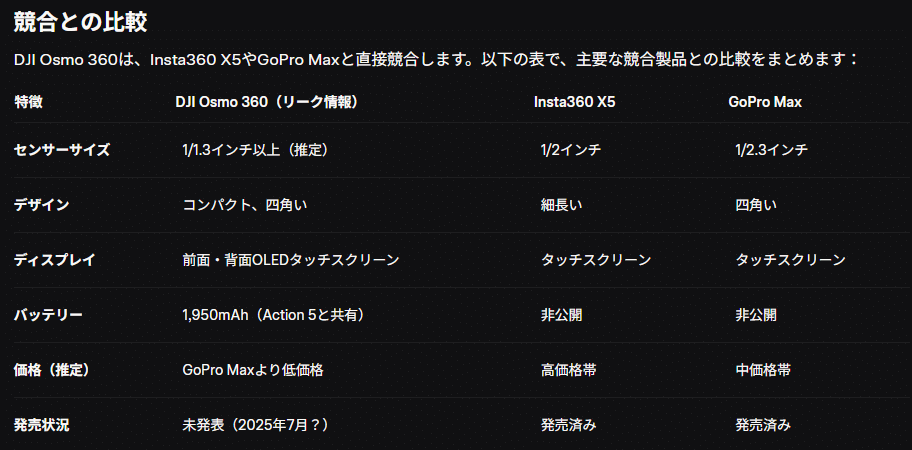 Insta360 X5は8K解像度の360度撮影が可能な高性能カメラで、GoPro Maxも堅実な性能を提供します。DJI Osmo 360は、DJIの画像処理技術やエコシステムの強みを活かし、競合に匹敵する性能を提供する可能性があります。特に、価格競争力とMimoアプリの使いやすさが差別化要因となるでしょう。