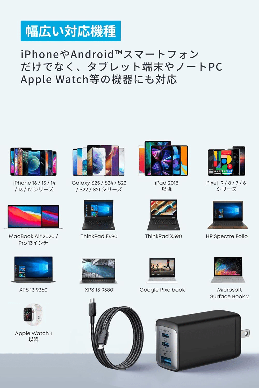 幅広い対応機種 – Anker PowerPort III 3-Port 65W Pod: コンパクトで高性能な充電器