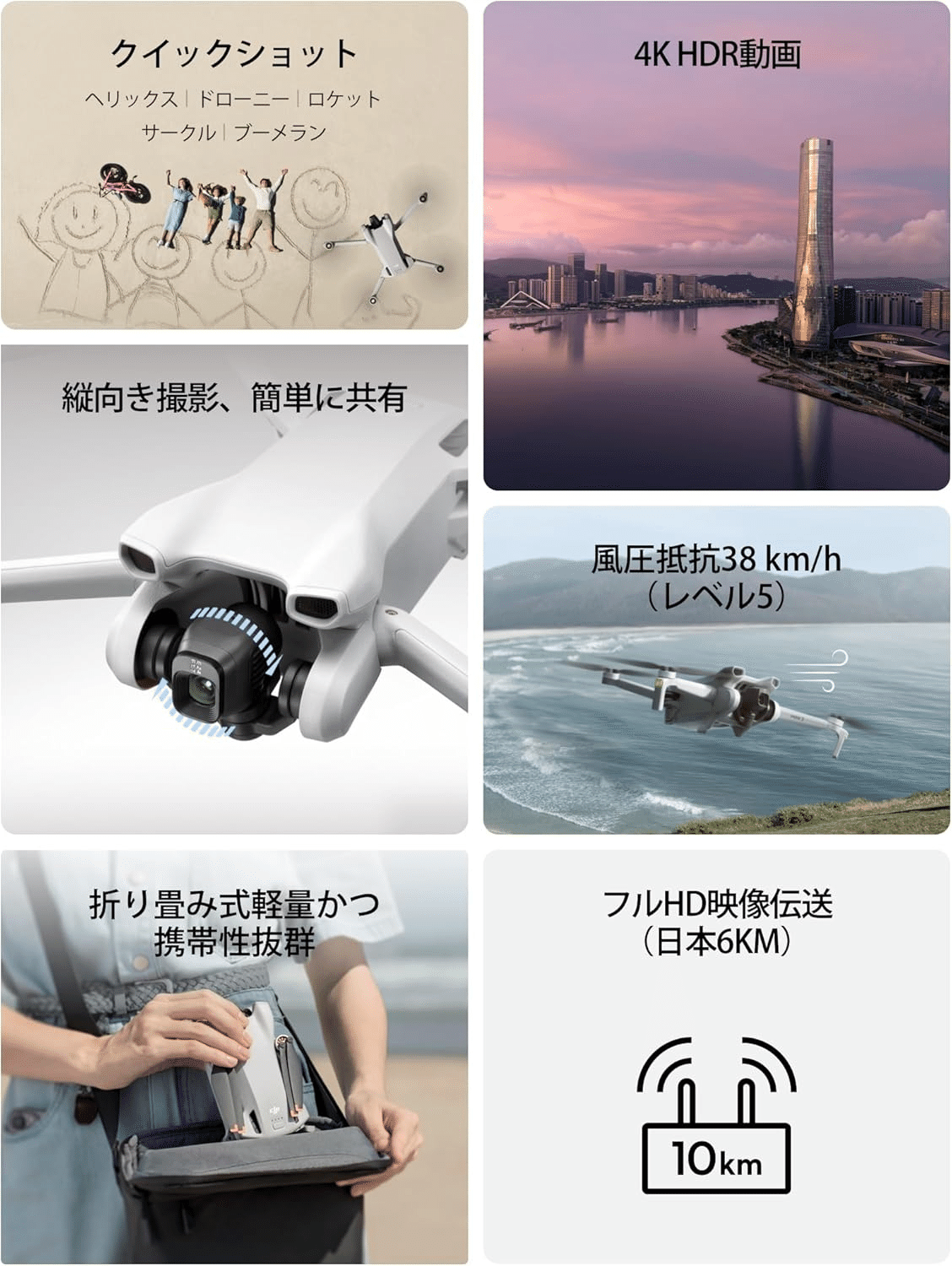 DJI Mini 3(RCリモコン付属)は、軽量でコンパクトながら高性能なミニカメラドローンです。4K HDR動画や縦向き撮影で、SNS映えする映像を簡単に撮影可能。38分の長時間飛行は、じっくり撮影したいシーンで活躍します。クイックショットなどのインテリジェント機能は初心者でもプロのような映像を作りやすく、自動帰還や衝突センサーで安全性も確保。賠償責任保険1年無償付きで、万が一の時も安心です。リモートID対応で法規制にも準拠し、ハイキングや旅行での空撮に最適。価格は手頃で、初心者から中級者まで幅広くおすすめできる一台です。