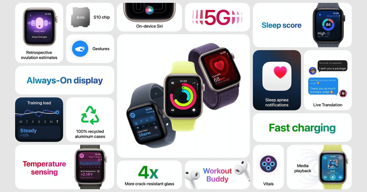温度センサーで、体温を連続監視。女性の月経周期予測や、感染症早期検知に役立ちます。ECG機能で心電図を取得、AFib検出が可能。加速度計 (16g耐性) とジャイロで、歩数や姿勢を正確記録。高度計でエレベーター使用をカウントします。メンタルヘルスアプリが拡張され、マインドフルネスセッションをガイド。騒音レベル監視で、聴覚保護を促します。これらのセンサーは、FDAクリアランスを取得し、信頼性が高いです。予防医療のツールとして、ユーザーのウェルネスを支えます。