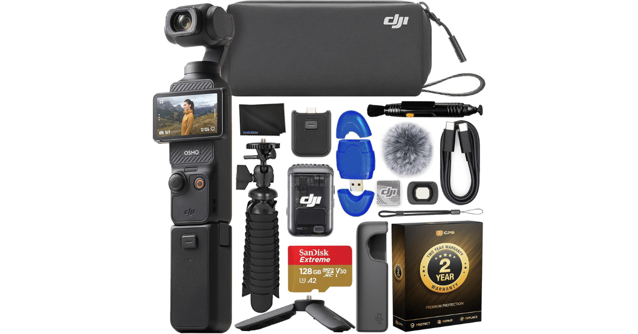 付属アクセサリー DJI Mic 2トランスミッター、広角レンズ、バッテリーハンドル、ミニ三脚、キャリングバッグ、保護カバー、リストストラップ、1/4インチスレッドハンドル、128GBメモリーカード、Gripsterフレキシブルスパイダー三脚、2年間CPS保証
