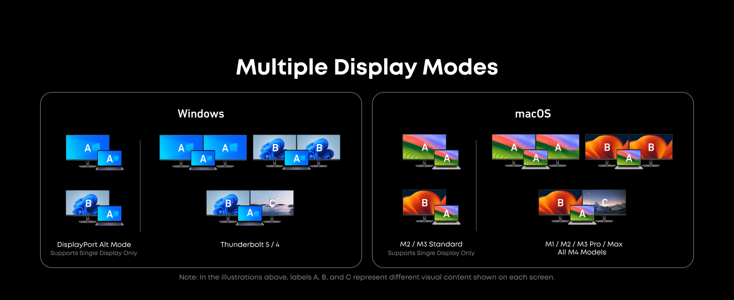 4. Windows laptops with USB-C ports that support DisplayPort Alt Mode can only connect to one external monitor. Apple Silicon MacBooks with M1 / M2 / M3 Standard chips support only one external display via Thunderbolt. MacBooks with M1 / M2 / M3 Pro or Max chips, and all M4 models, support dual displays. M4 MacBooks with Thunderbolt 5 do not support three displays over a single Thunderbolt 5 connection.