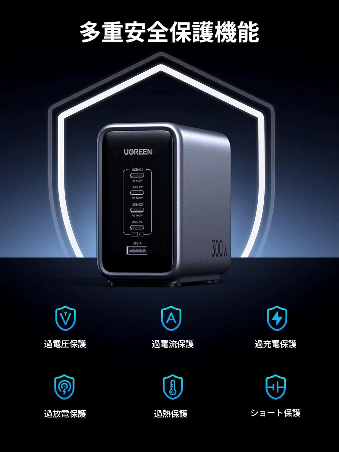 多重安全保護機能 – UGREEN Nexode 300W 5ポート急速充電器