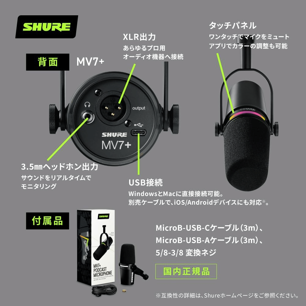 • Title SHURE シュア MV7+ ポッドキャストマイクロホン ブラック MV7+-K : OBS 認証 ダイナミックマイク カーディオイド 単一指向性 USB-C XLR 有線 ノイズ除去 配信 ストリーミング YouTube 録音 レコーディング 音楽 実況 ゲーム ゲーミング ボーカル DTM 宅録 テレワーク iOS Android Mac Windows対応 【国内正規品/メーカー保証2年】
