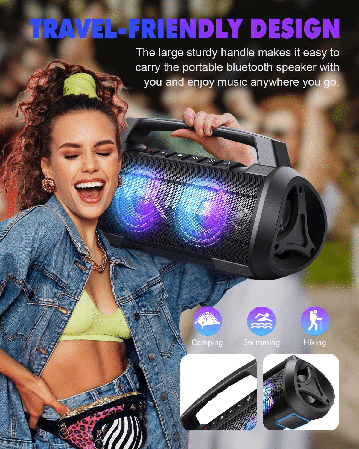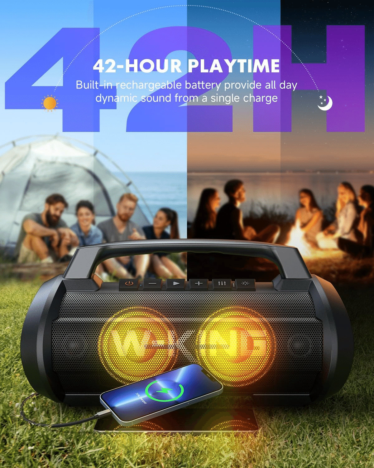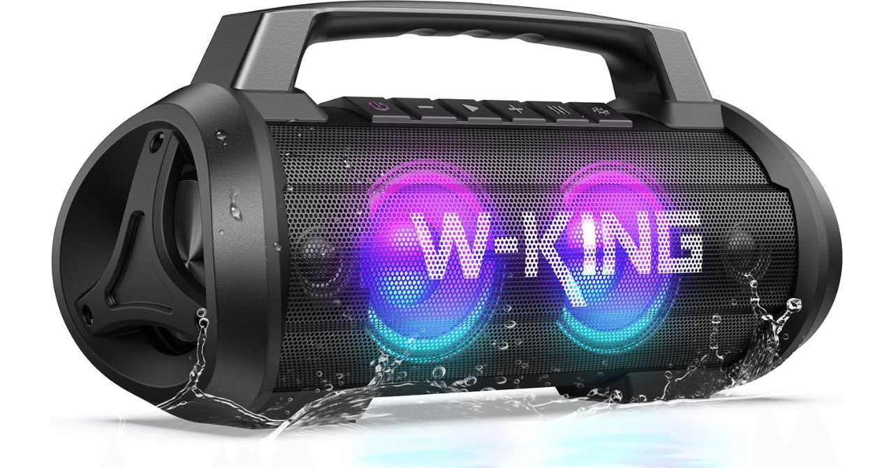 Title 70W(120Wピーク)スピーカー bluetooth、IPX6防水 防塵 ワイヤレス スピーカー 大音量、W-KING ポータブルスピーカー ステレオ【パーティーライト、マイクポート、42時間連続再生、強化された低音(イコライザー)、2台ペアリング/パワーバンク、Bluetooth 5.0、マイク内蔵、TFカード対応、AUX】