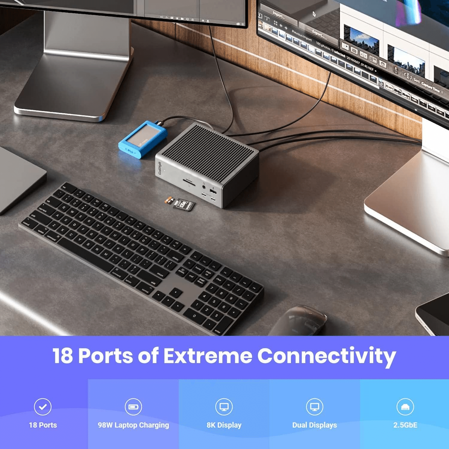 CalDigit TS4/ Thunderbolt Station 4は、プロフェッショナル向けの最高峰ドッキングステーションです。18ポートの豊富な接続性、最大98Wの電力供給、2.5GbEイーサネットによる高速通信が特徴。8K単一ディスプレイやデュアル6Kディスプレイに対応し、クリエイティブな作業を強力にサポートします。MacやWindows、iPadなど幅広いデバイスで使える汎用性も魅力。縦置き・横置き対応のデザインはデスクを整理し、ワークスペースをスマートに保ちます。やや高価ですが、ポート不足を解消し、効率的な作業環境を求める方に最適。ファームウェア更新で最新機能を利用でき、長期間活躍する投資価値の高い製品です。