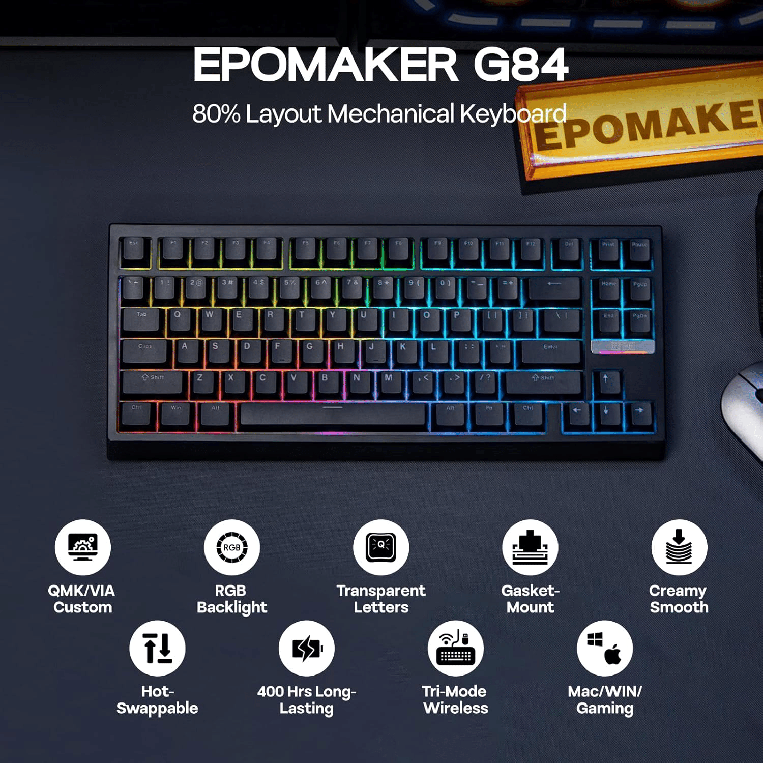EPOMAKER G84 80% RGBゲーミングメカニカルキーボードは、コンパクトなデザインと高性能を両立したゲーマーやタイピスト向けの製品です。ブラックのスタイリッシュな外観に、透光PBTキーキャップを採用し、鮮やかなRGBバックライトが特徴です。有線、2.4GHz、Bluetooth 5.0の3つの接続方法に対応し、QMK/VIAプログラマブルで自由なカスタマイズが可能です。ホットスワップ対応でスイッチ交換も簡単。ガスケットマウント構造と5層の防音設計により、静かで心地よい打鍵感を実現。ゲーミングから日常使いまで幅広く対応する、コストパフォーマンスに優れたキーボードです。