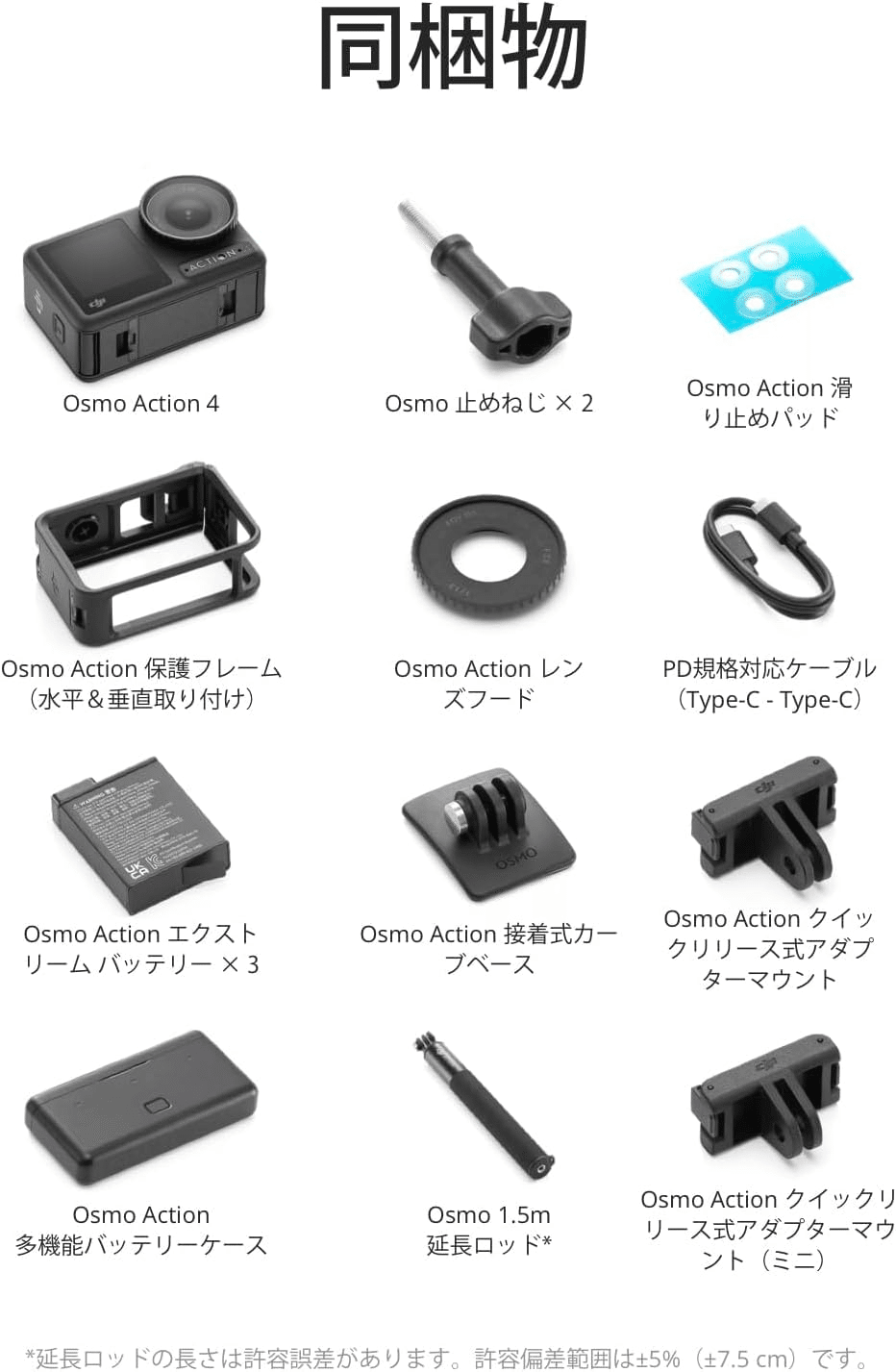 アドベンチャーコンボ内容 カメラ、3バッテリー、充電ケース、1.5m拡張ロッド、クイックリリースマウント