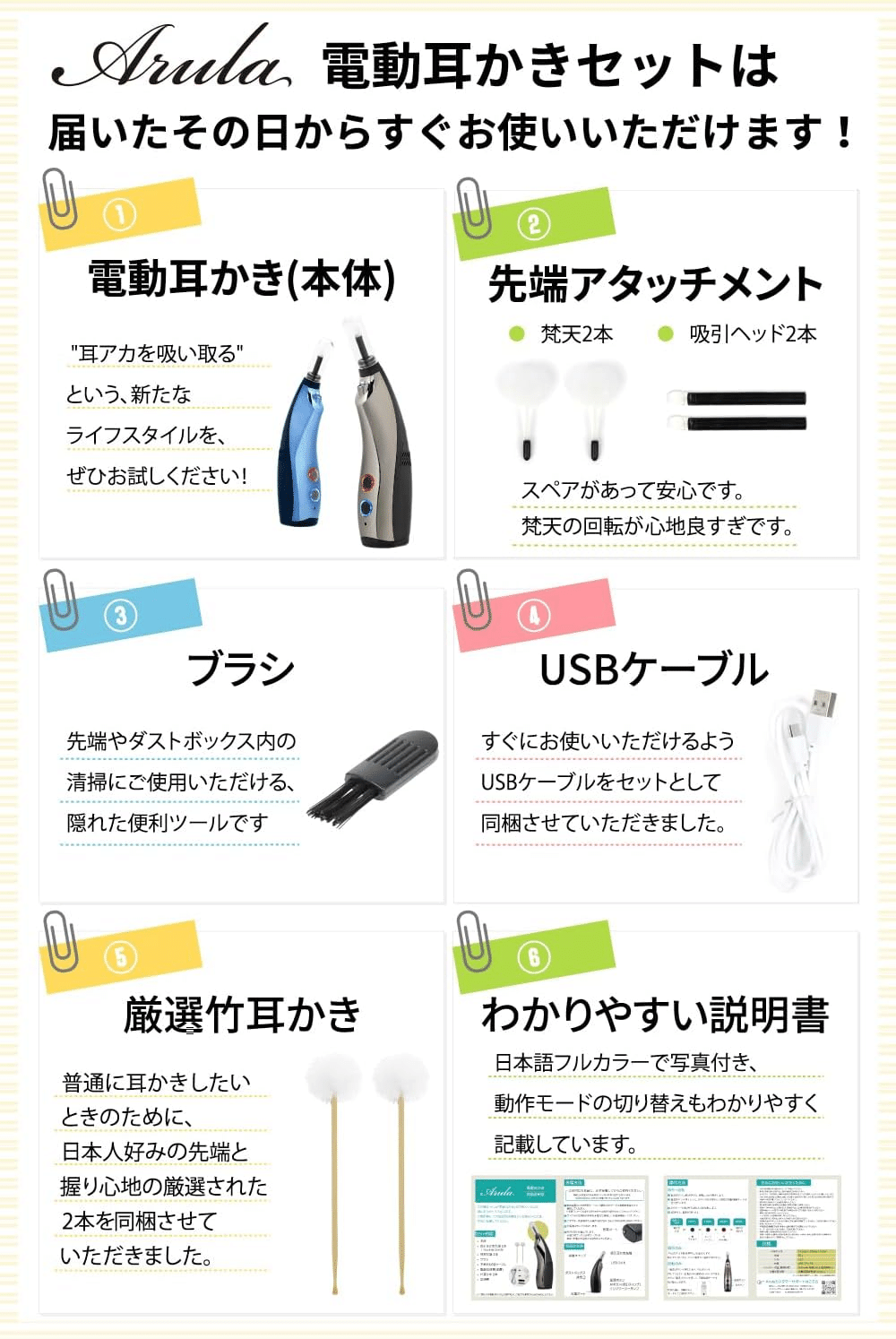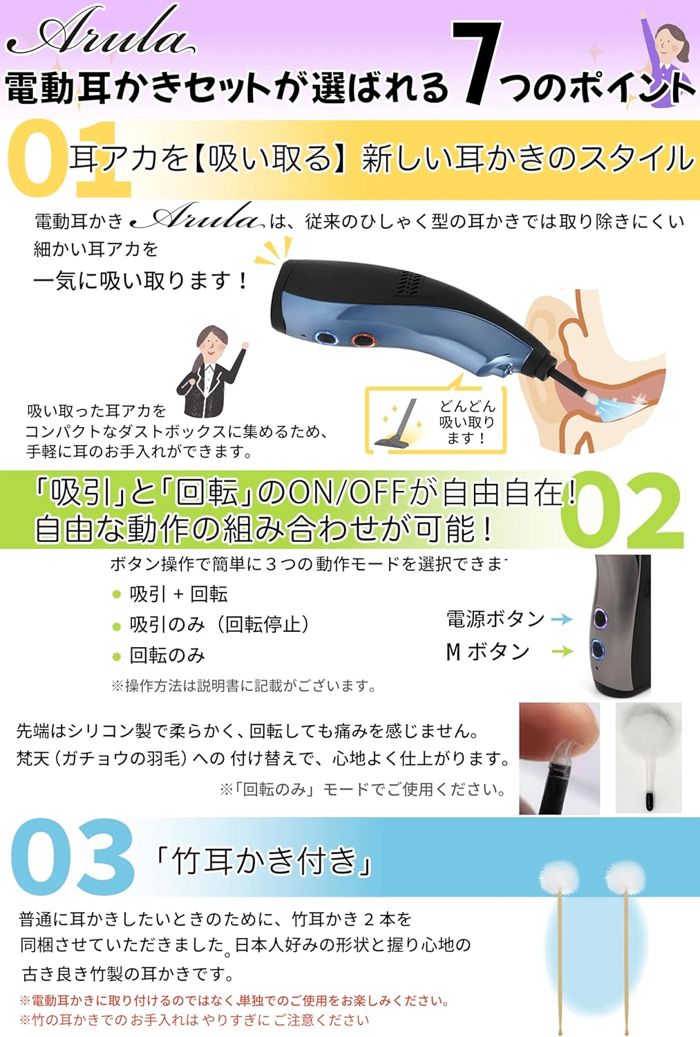 Title 電動耳かき 吸引 イヤーケアセット リラックス 快適 極昇 クリーナー 回転 360° 3段階 自動反転 耳かき 竹耳かき(2本)付き お手入れかんたん ピッタリ収納ケース フルカラー日本語説明書 耳掃除 耳掻き 耳垢 こども ケア 介護 父の日 母の日 敬老の日 (ブルー)