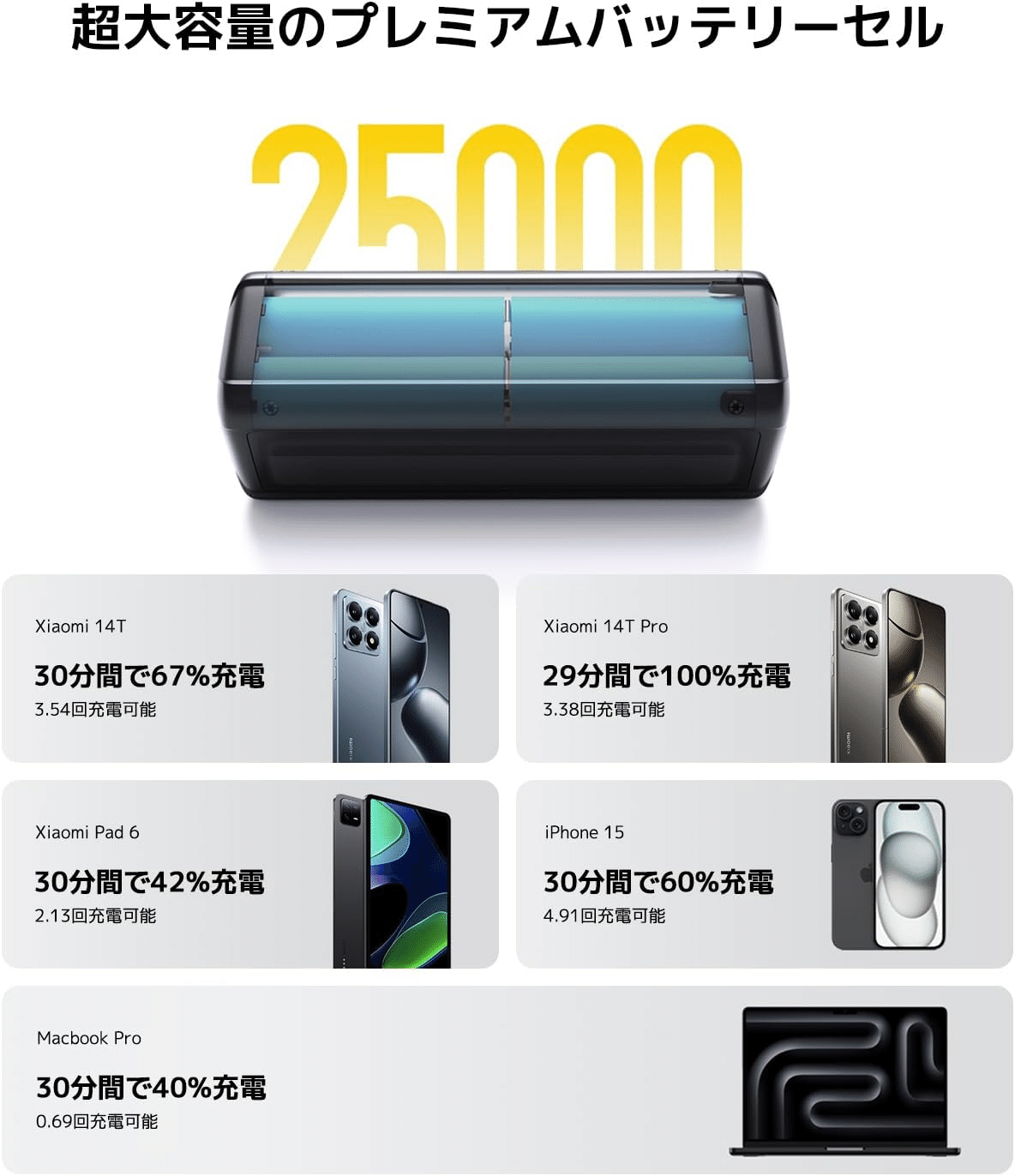 Xiaomi 212W HyperCharge Power Bank 25000は、圧倒的な212W出力と25,000mAhの大容量で、複数のデバイスを同時に急速充電できる優れもの。シングルポート最大140WでノートPCも高速充電可能で、本体の充電も100W対応で約2.5時間とスピーディー。透明デザインとカラーディスプレイは視覚的にも魅力的で、ガジェット好きにはたまらない一品です。PSE認証済で安全性が高く、航空持ち込みも可能な90.8Whは旅行や出張に最適。ただし、633gとやや重い点は携帯性を重視する人には考慮が必要。iPhone、Android、Switchなど幅広い互換性で、日常使いから防災まで活躍。価格も性能に対して手頃で、ハイパワーなモバイルバッテリーを求める人に強くおすすめできる。