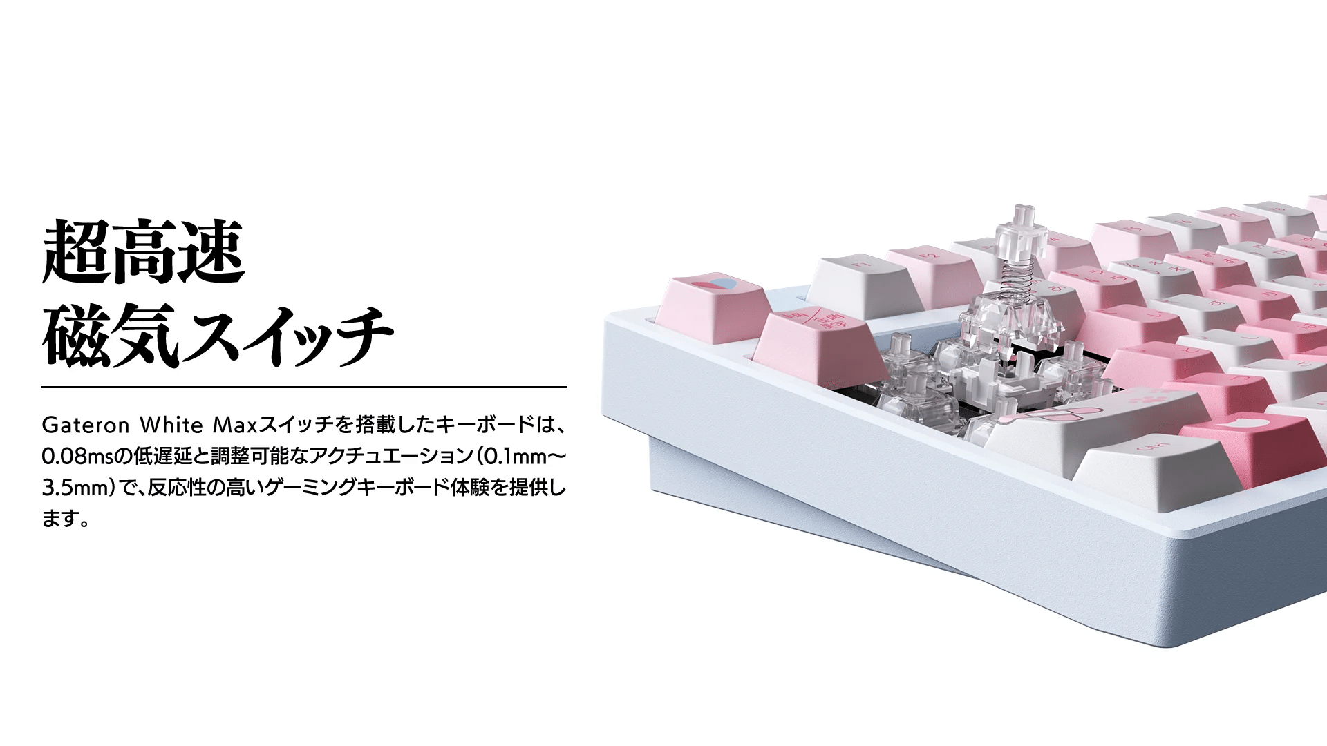 採用した磁気スイッチは8000Hzの高ポーリングレート、最大0.01mmに対応したラピッドトリガー、調整可能なアクチュエーション(0.1mm~3.5mm)に対応し、グッズだけに留まることはなく本格的なゲーム体験をも可能にします。