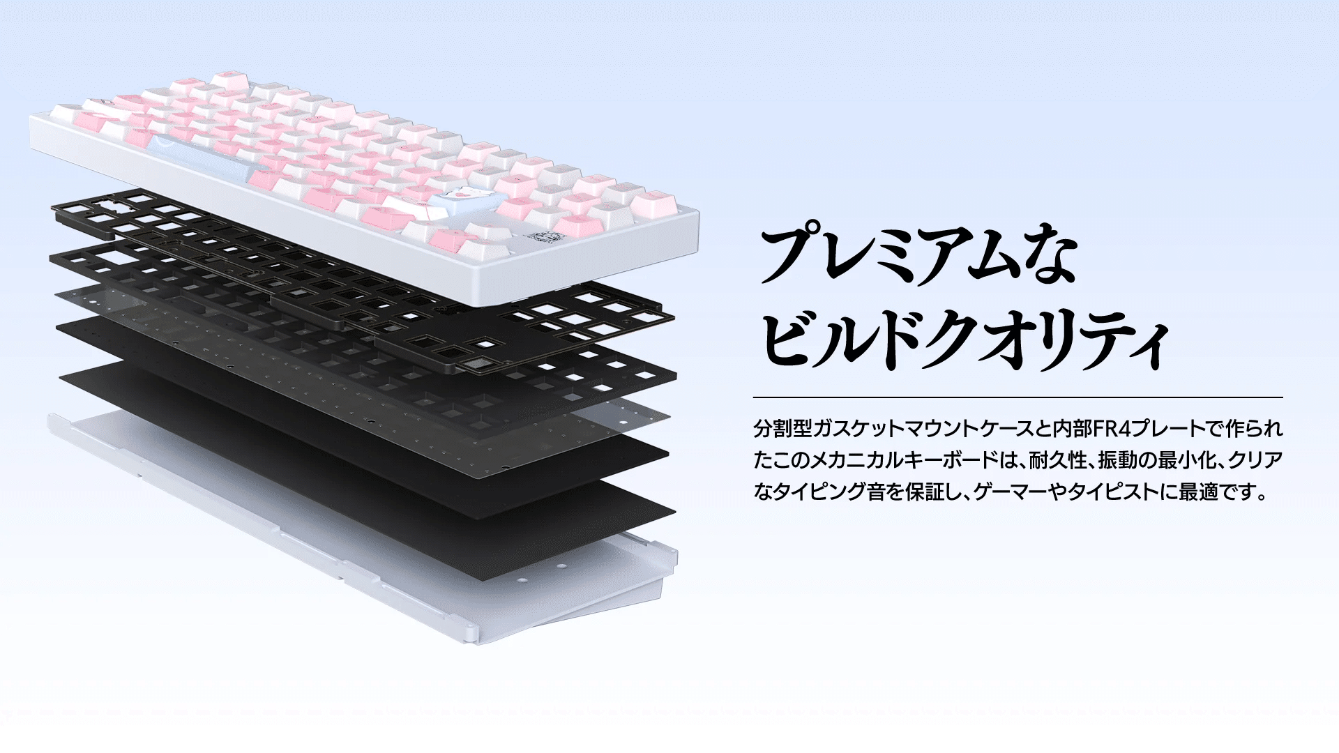 アルミフレームを採用し、今までにない高級感と卓越された打鍵感を実現しました。分割型ガスケットマウントケースと内部FR4プレートで作られたこのゲーミングキーボードは、耐久性、振動の最小化、クリアなタイピング音を保証し、ゲーマーやタイピストに最適です。
