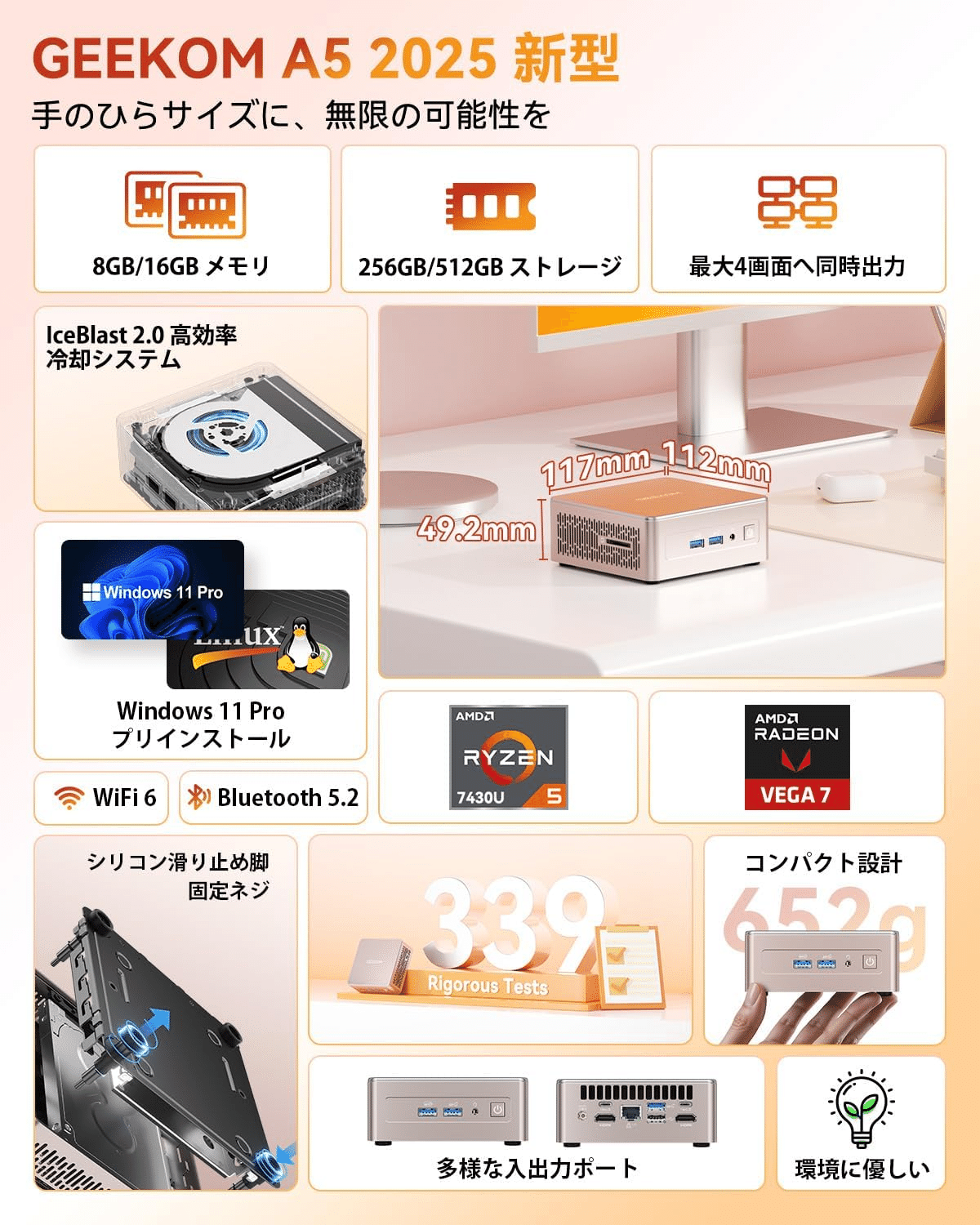 GEEKOM A5 2025 ミニPC Ryzen 5 16GB 512GB