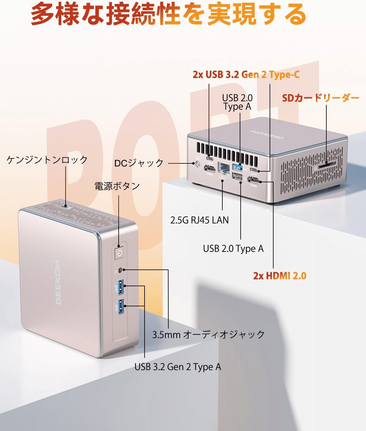 ディスプレイ出力: 最大8K、4画面同時出力(HDMI 2.0b×2、USB-C×2)
