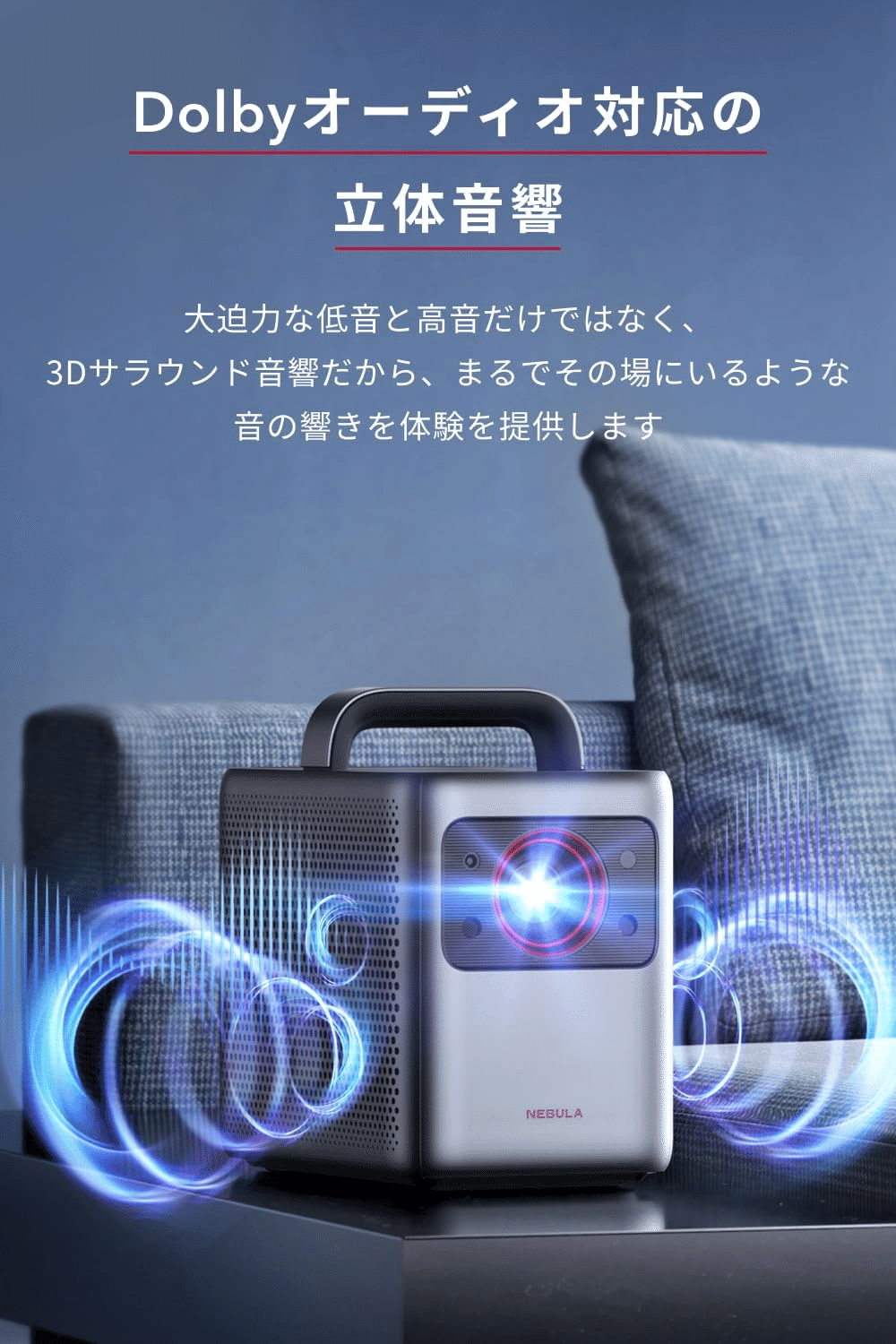 Anker Nebula Cosmos Laser 4Kは、家庭で本格的なホームシアター体験を実現するレーザープロジェクターです。2200 ANSIルーメンの高輝度で、明るい部屋でも鮮明な映像を投影。4K UHD解像度とHDR10対応により、色彩豊かでリアルな映像美を楽しめます。Android TV 10.0を搭載し、Netflixなどのストリーミングサービスに簡単にアクセス可能。オートフォーカスや自動キーストーン補正で設置も簡単です。Dolby®︎ Digital Plusによる迫力のサウンドも魅力で、最大150インチの大画面で映画やゲームを堪能できます。持ち運びやすいハンドル付きで、部屋から部屋への移動もスムーズ。エンターテインメントを次のレベルに引き上げる一台です。