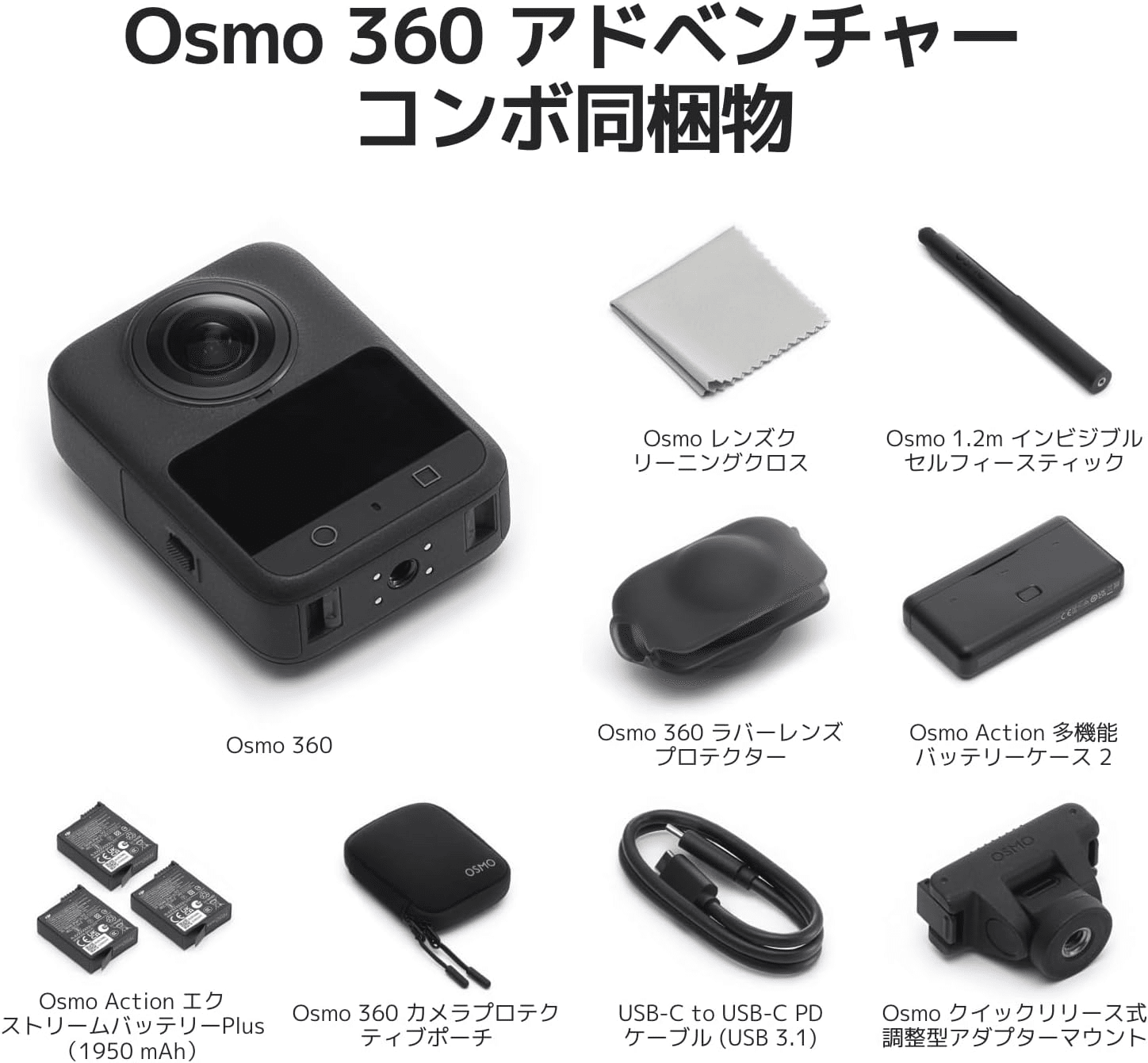 アドベンチャーコンボ内容 Osmo 360本体、バッテリー3個、多機能バッテリーケース、1.2mインビジブルセルフィースティック、クイックリリースアダプター等