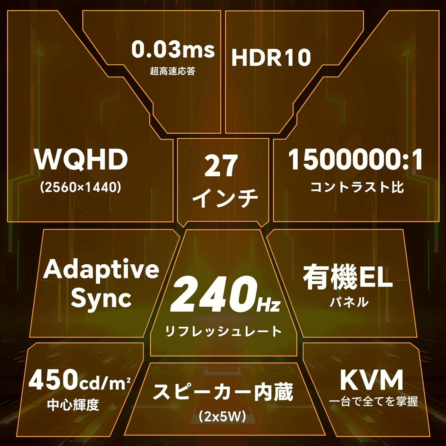 KTCの27インチ有機ELゲーミングモニターは、WQHD(2560×1440)の高解像度と240Hzのリフレッシュレートで、滑らかかつ鮮明な映像を提供します。応答速度は超高速0.03msで、動きの激しいゲームでも残像感を最小限に抑えます。OLEDパネルによる深い黒と136% sRGBの広色域、1500000:1のコントラスト比で、リアルな色彩と高コントラストを実現。DisplayHDR True Black 400対応で、映像美を極めます。さらに、KVM機能やRGBライト、Type-C 65W給電対応など、多機能性も魅力。ゲーマーやクリエイターに最適な一台です。