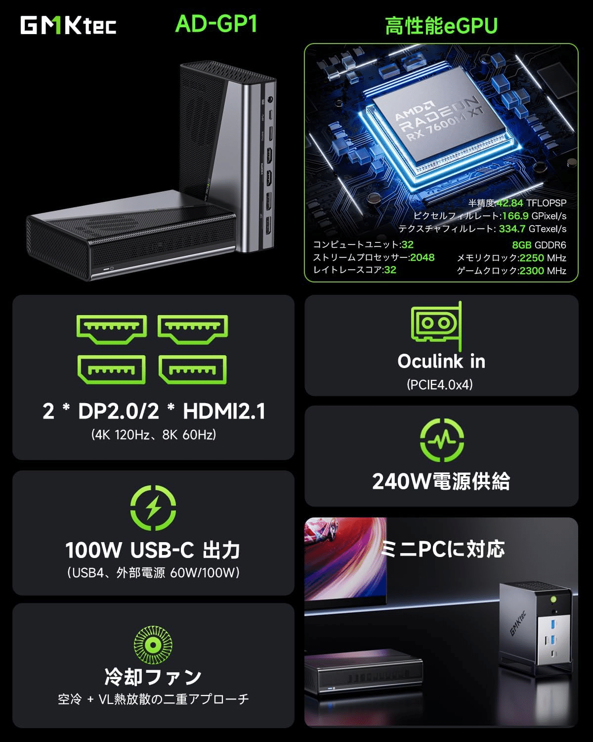 GMKtec eGPU RX 7600M XTは、8GB GDDR6でゲーミングを強化する外付けGPU。USB4/OCulink接続で2300MHzの高速性能、HDMI/DisplayPortで高画質出力を実現!