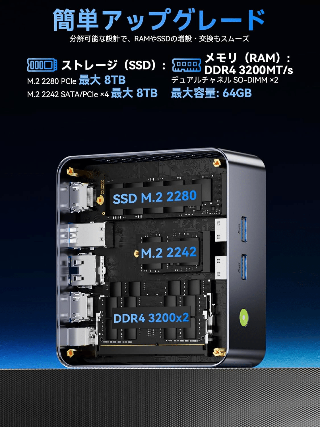 ストレージ: 16TB M.2 2280 NVMe SSD(PCIe 3.0)