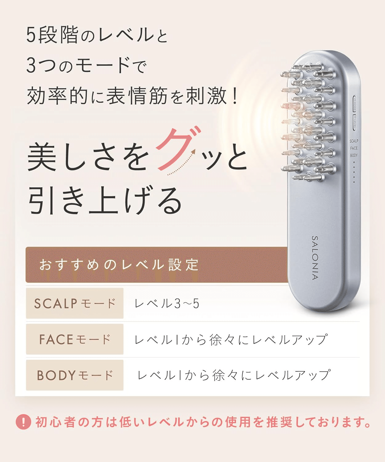 サロニア EMSリフトブラシは、顔や頭皮、ボディのケアを一台で叶える優れた美顔器です。独自のEMS技術が筋肉にアプローチし、肌のハリやリフトアップをサポート。3Dフィットピンが肌に密着し、ムラなく刺激を伝えます。温感機能でリラックス効果も高く、防水設計でお風呂でも使える手軽さが魅力。操作は簡単で、5段階のEMSレベル調整により肌の状態や好みに合わせたケアが可能。忙しい日常でもスキンケアに取り入れやすく、デザイン性も高いので持ち歩きにも便利です。ユーザーの声では、引き締め感やスッキリ感が高評価で、特にフェイスラインや頭皮ケアに効果を実感する意見が多いです。ただし、敏感肌の方は低レベルから試し、保湿を徹底することが推奨されます。コスパも良く、自宅でエステ体験を求める方に最適なアイテムです。