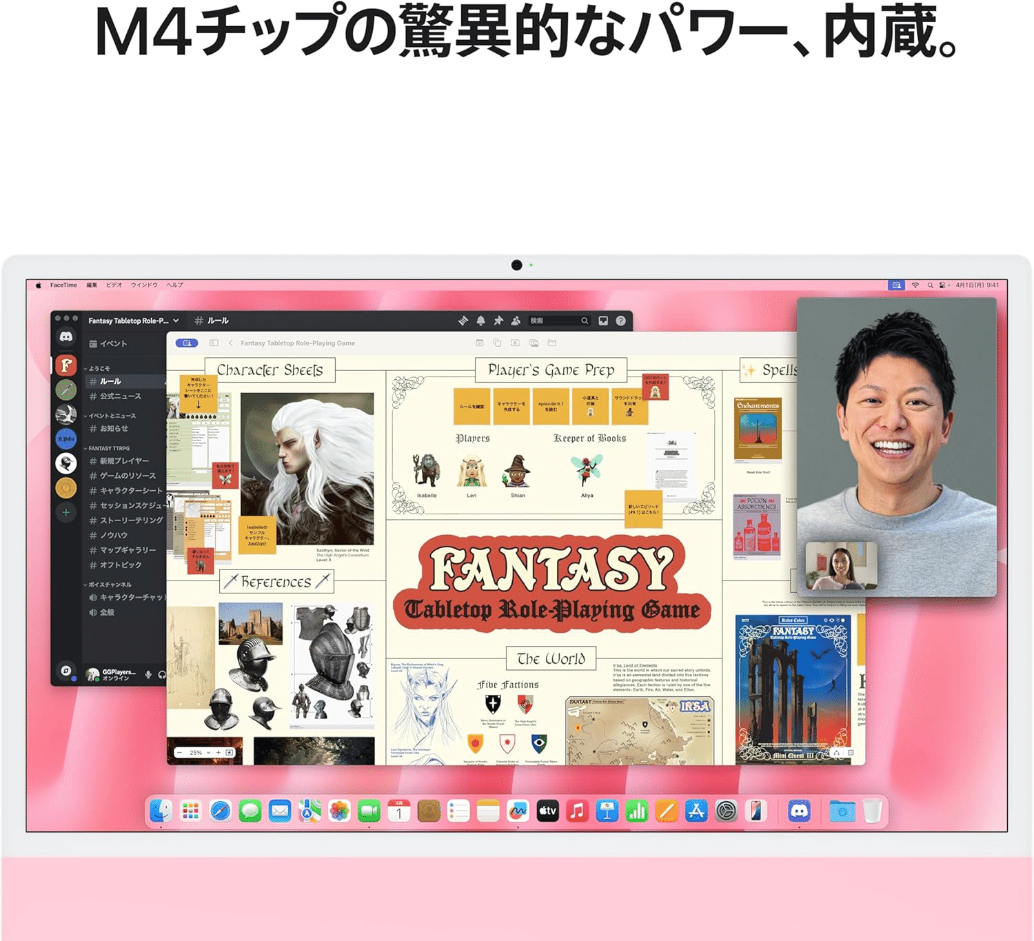 Appleの2024年モデルiMacは、鮮やかなピンクのボディが目を引くオールインワンデスクトップです。M4チップ搭載で、Apple Intelligenceに対応し、高速なパフォーマンスを実現。24インチのRetinaディスプレイは、鮮明で美しい映像を提供します。16GBのユニファイドメモリと256GBのSSDストレージを備え、日常の作業からクリエイティブなプロジェクトまで幅広く対応。ボディと同色のアクセサリや、iPhone・iPadとのシームレスな連携機能も魅力です。デスクを彩るスタイリッシュな一台で、仕事も趣味も快適に楽しめます。