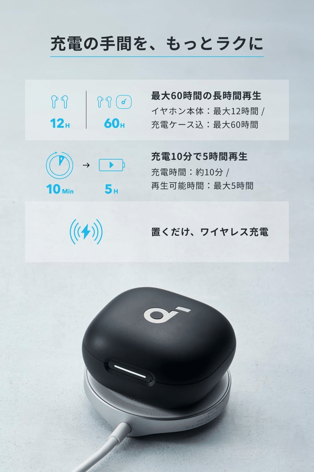 再生時間: 最大12時間(イヤホン単体)、最大60時間(ケース含む)
