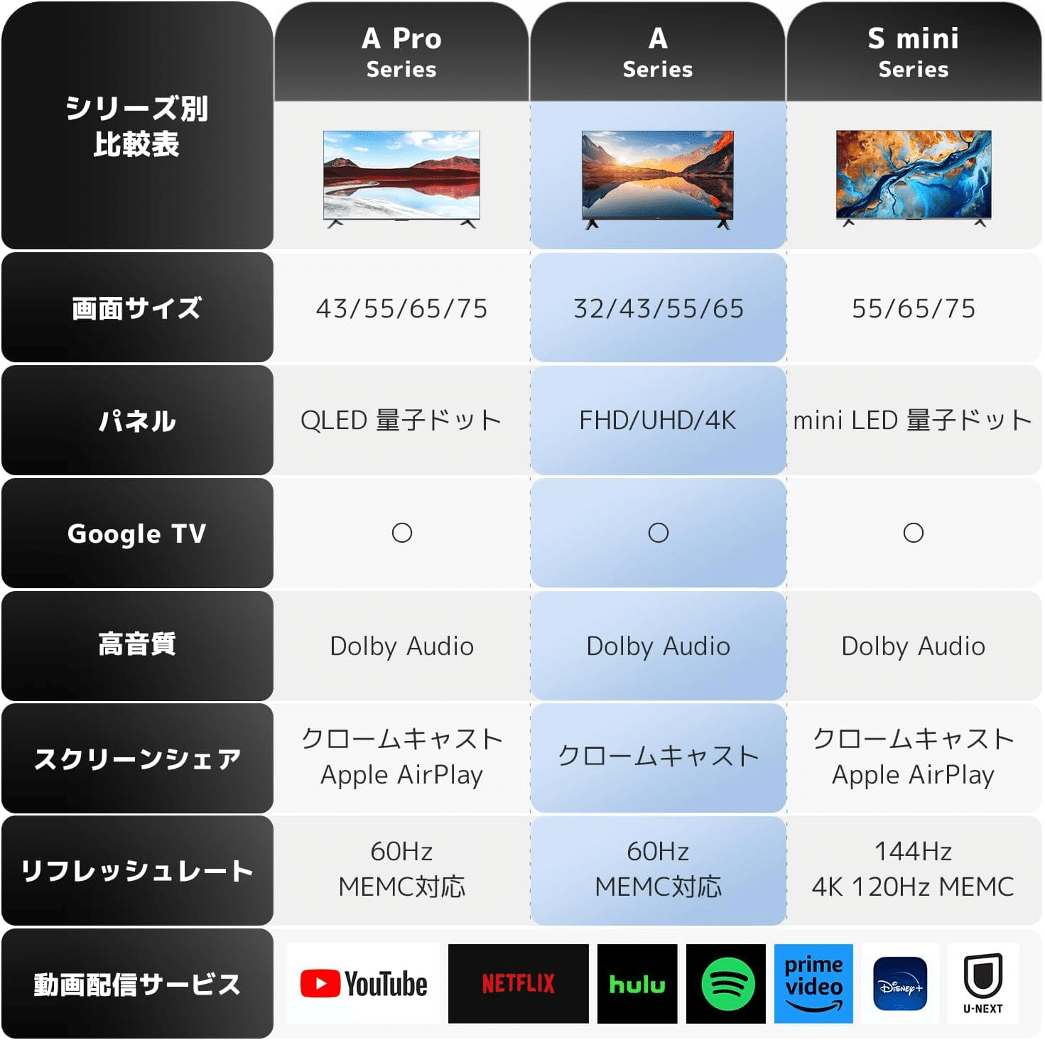 シャオミのXiaomi TV A 32 2025シリーズは、コンパクトながら高機能なチューナーレステレビとして、コストパフォーマンスに優れた選択肢です。HDR10対応の720P液晶ディスプレイは、鮮明な映像を提供し、MEMC技術によりスポーツやアクションシーンも滑らかに映し出します。Dolby AudioとDTS-Xによる音響は、映画や音楽を臨場感たっぷりに楽しめます。Google TVの搭載で、NetflixやYouTubeなどのネット動画に簡単にアクセスでき、音声検索で操作も快適。一人暮らしやセカンドテレビとして最適で、ベゼルレスデザインはインテリアにも馴染みます。ただし、地上波が見られない点は注意が必要。価格と性能のバランスが良く、スマートテレビ初心者にもおすすめのモデルです。