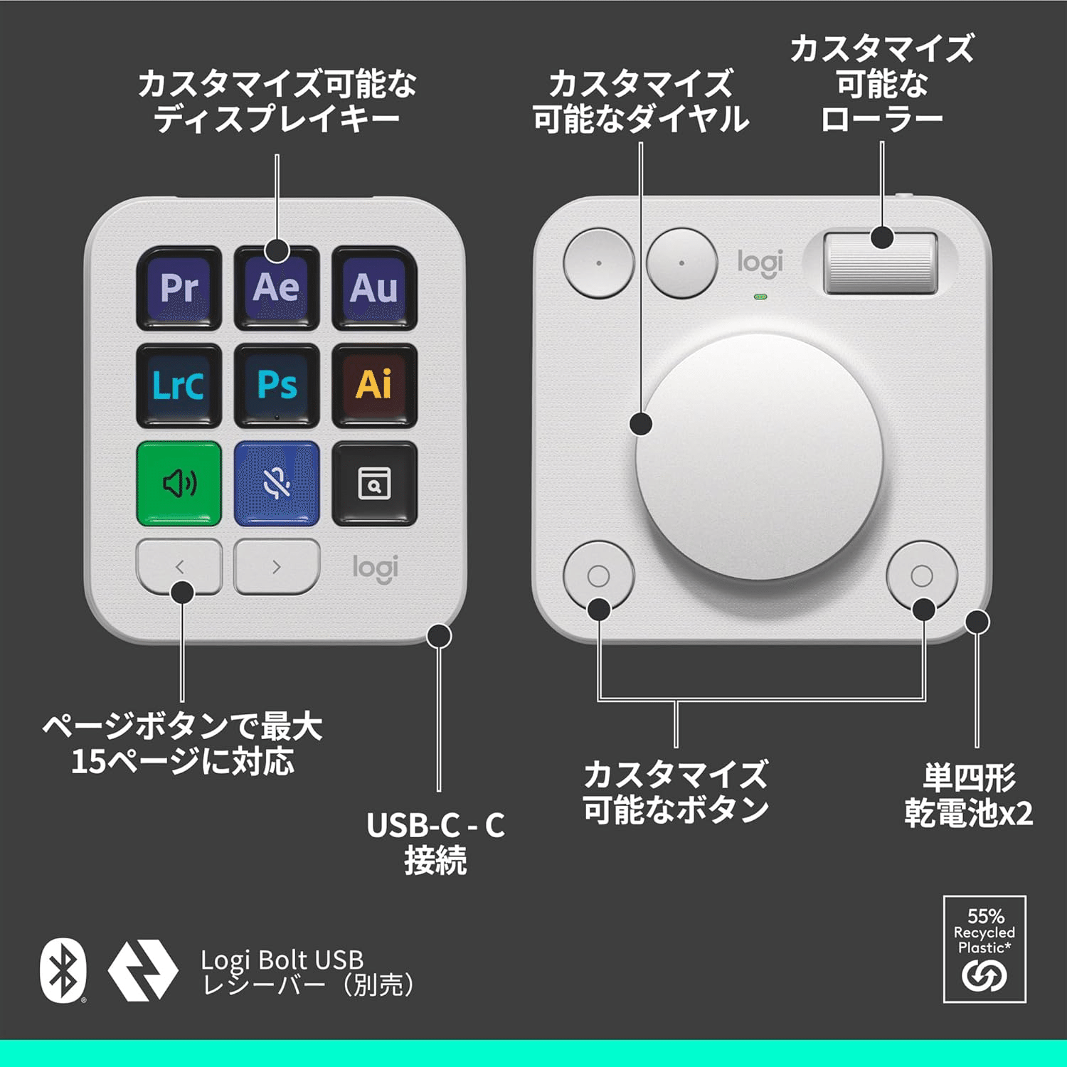 Title ロジクール MX クリエイティブ コンソール KXCCPG 左手デバイス キーパッド ダイヤルパッド DaVinci Resolve Adobe Photoshop Illustrator Premiere Pro After Effects Audition Bluetooth Logi Bolt USB Type-C 画像編集 動画編集 画像 動画 編集 ペイルグレー 国内正規品