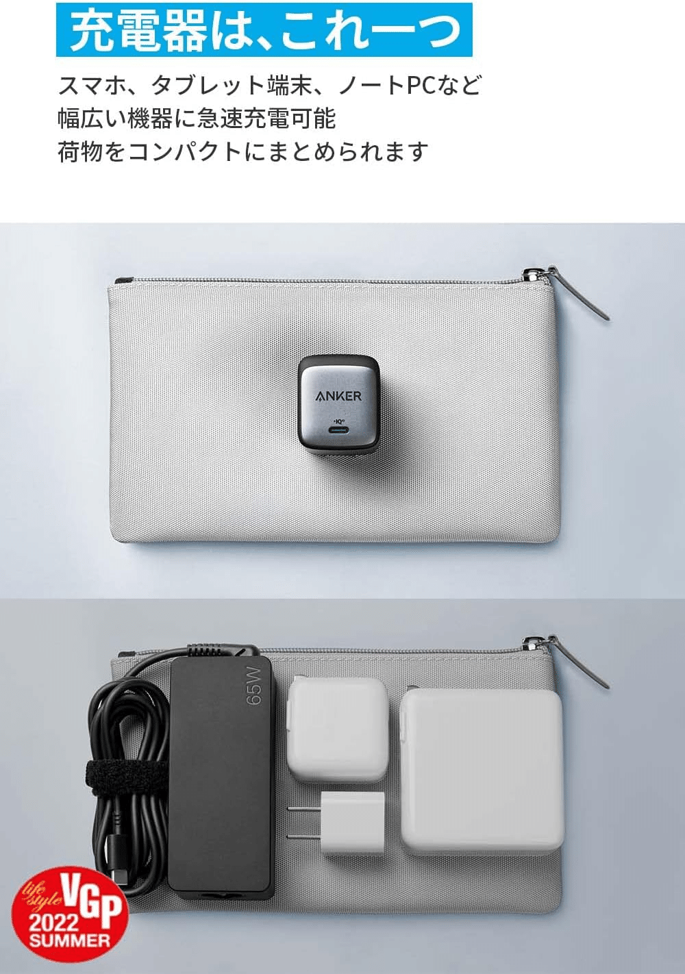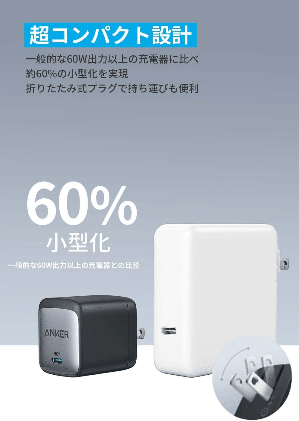標準的な61W充電器より58%小型、旅行や出張に最適