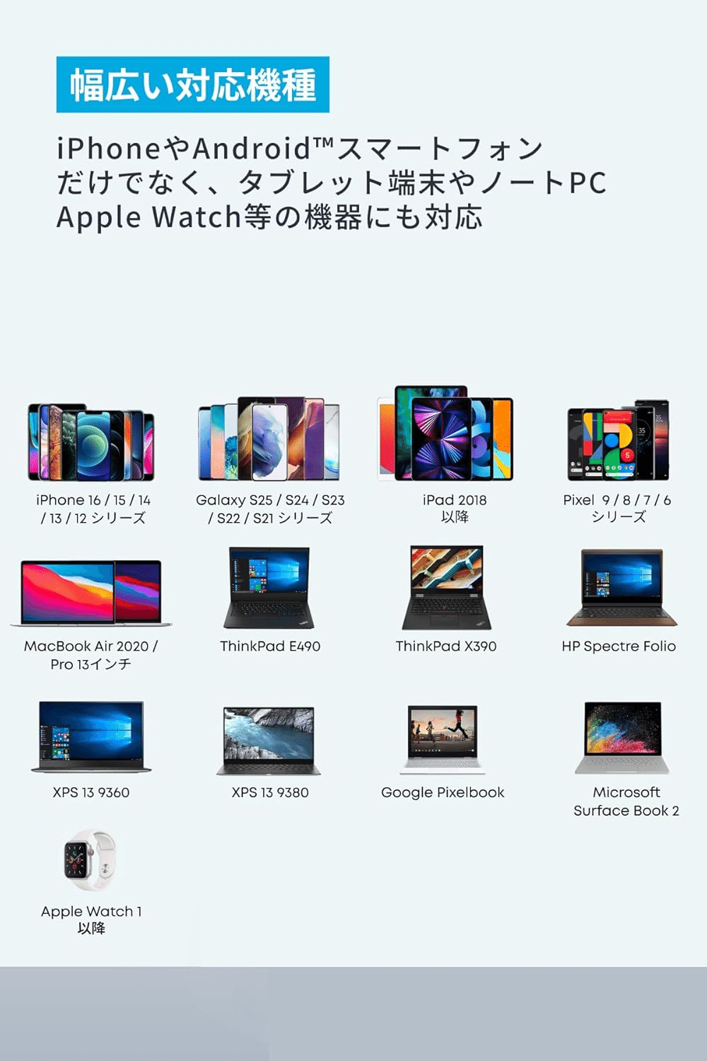 互換性: iPhone、iPad、MacBook、Galaxy、Android、Windows PC
