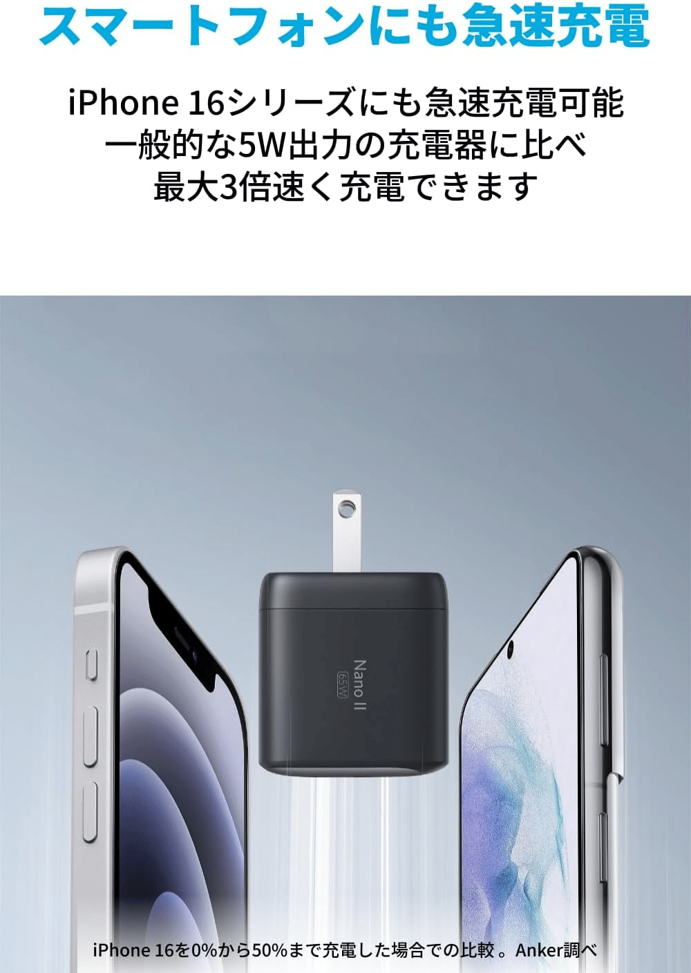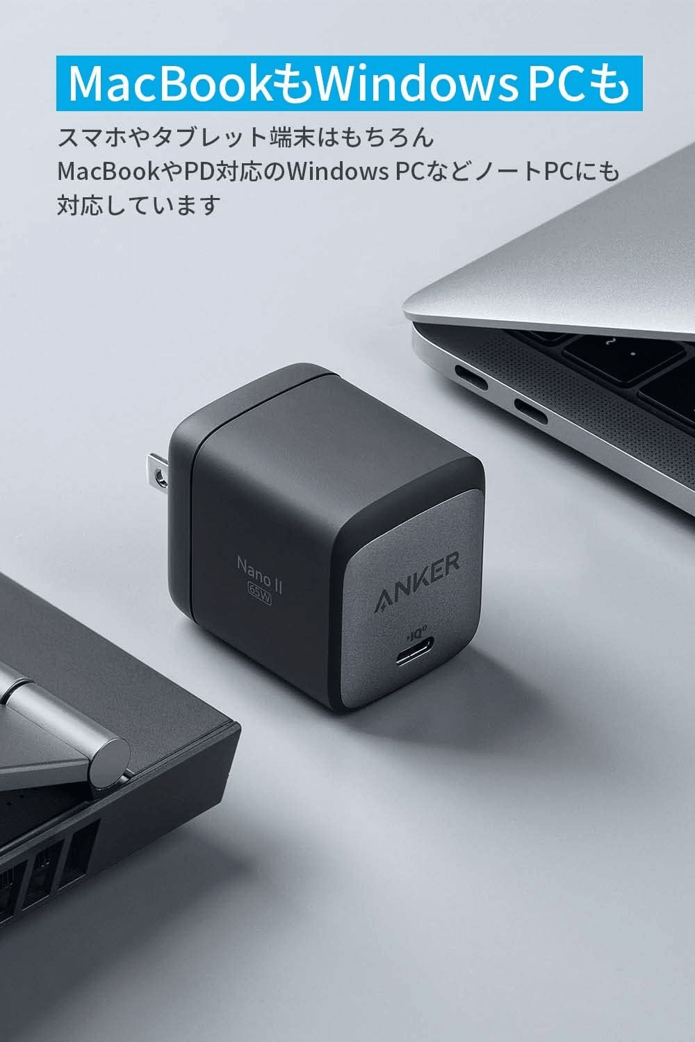 Anker Nano II 65Wは、スマホからノートPCまで急速充電できるコンパクト充電器。GaN II技術で超小型、折り畳みプラグで持ち運びも便利。65W出力でMacBookも高速充電!