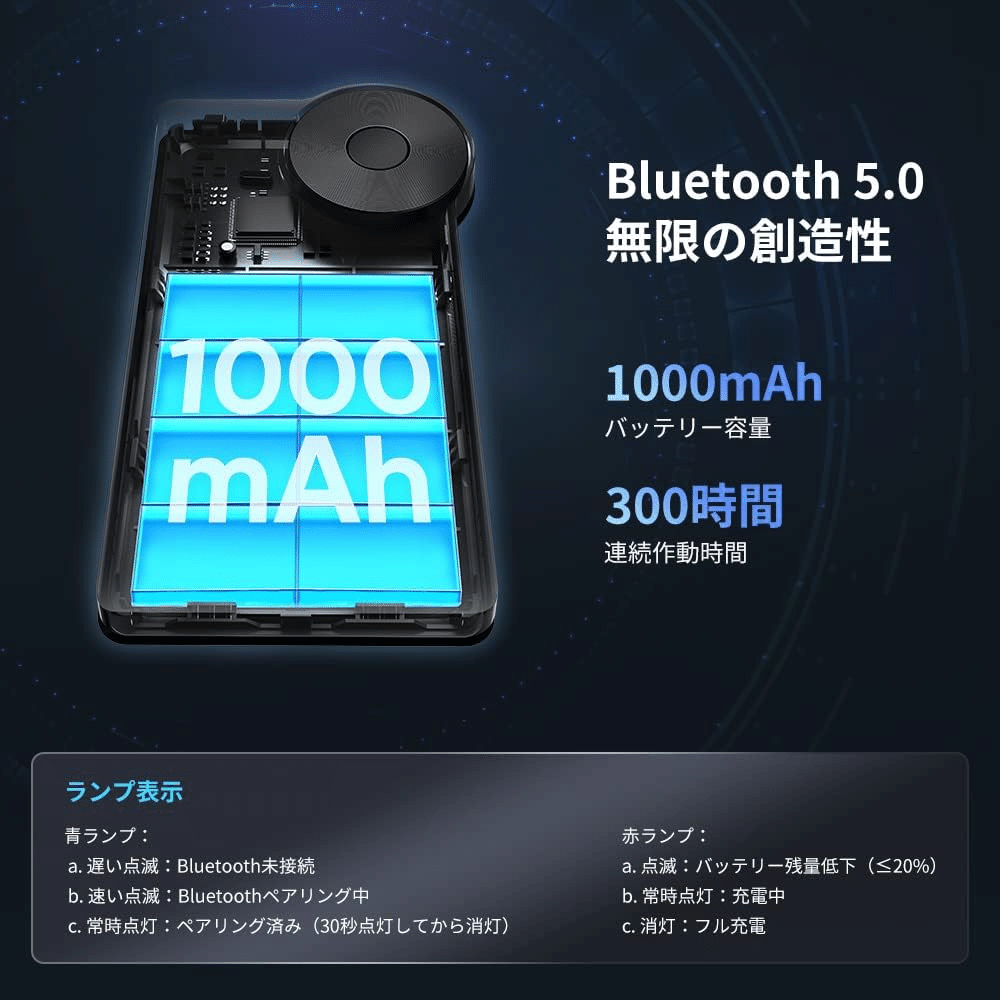 • インジケーター: 青(Bluetooth接続)、赤(充電/バッテリー残量)