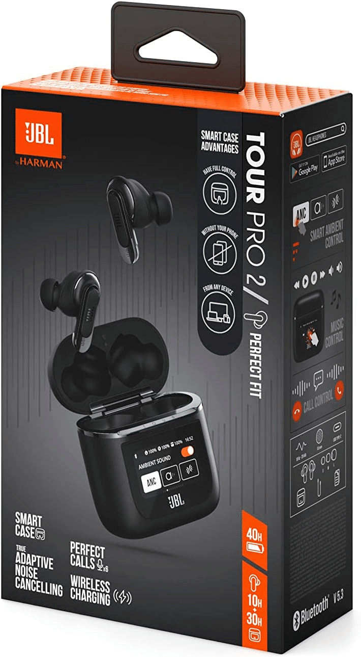 JBL TOUR PRO 2は、ハイブリッドノイズキャンセリングとスマートタッチディスプレイを搭載したワイヤレスイヤホンです。ブラックカラーのスタイリッシュなデザインで、IPX5防水性能やワイヤレス充電対応が特徴。6つのマイクによるクリアな通話と、最大40時間の長時間再生が可能。JBLのプロサウンド技術により、深みのある低音とクリアな音質を提供します。マルチポイント接続で、複数のデバイスをシームレスに切り替え可能。音楽、通話、仕事、どんなシーンでも活躍する一台です。