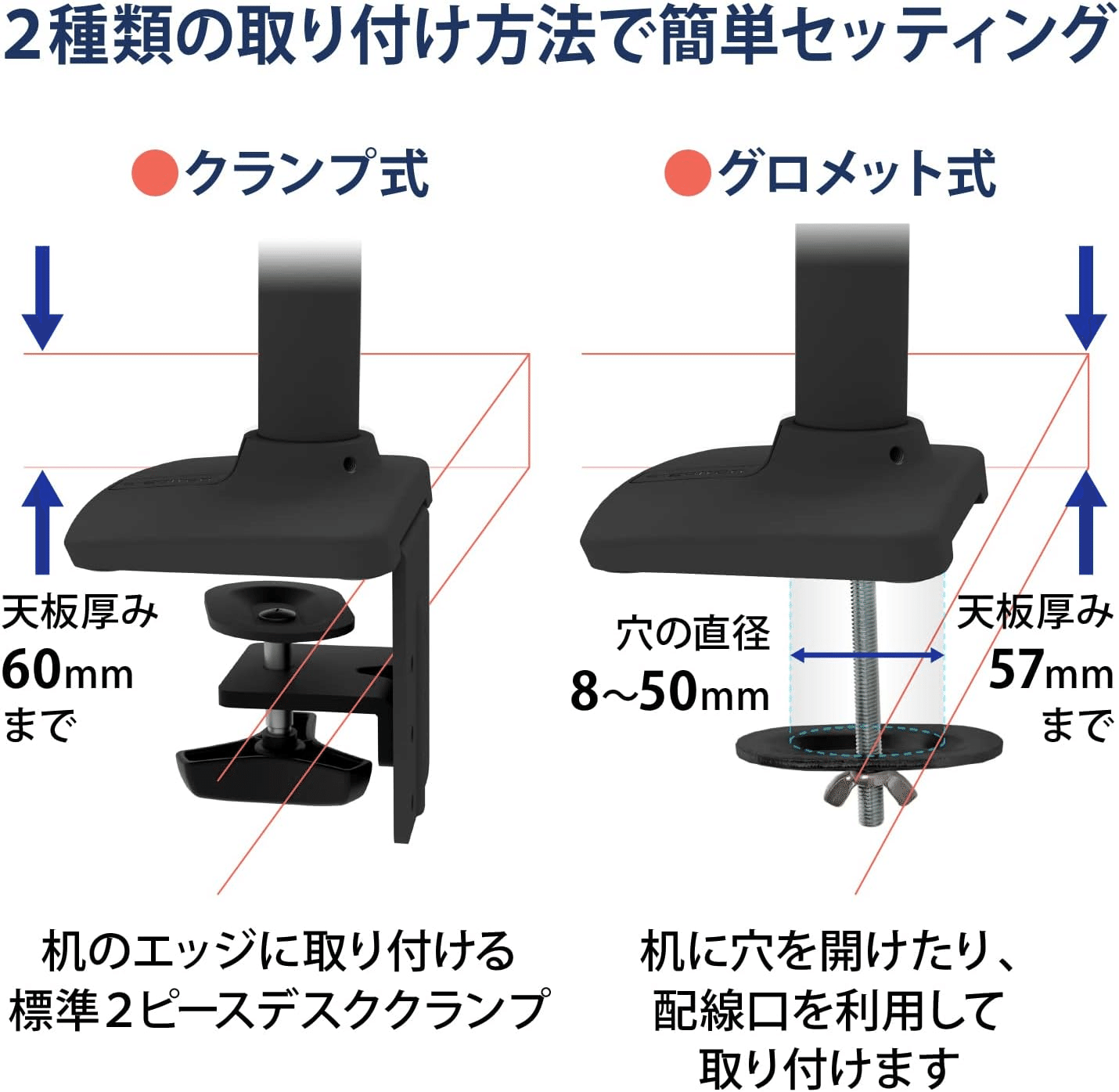 取り付け: デスククランプ(厚さ10~60mm)、グロメットマウント(厚さ57mmまで)