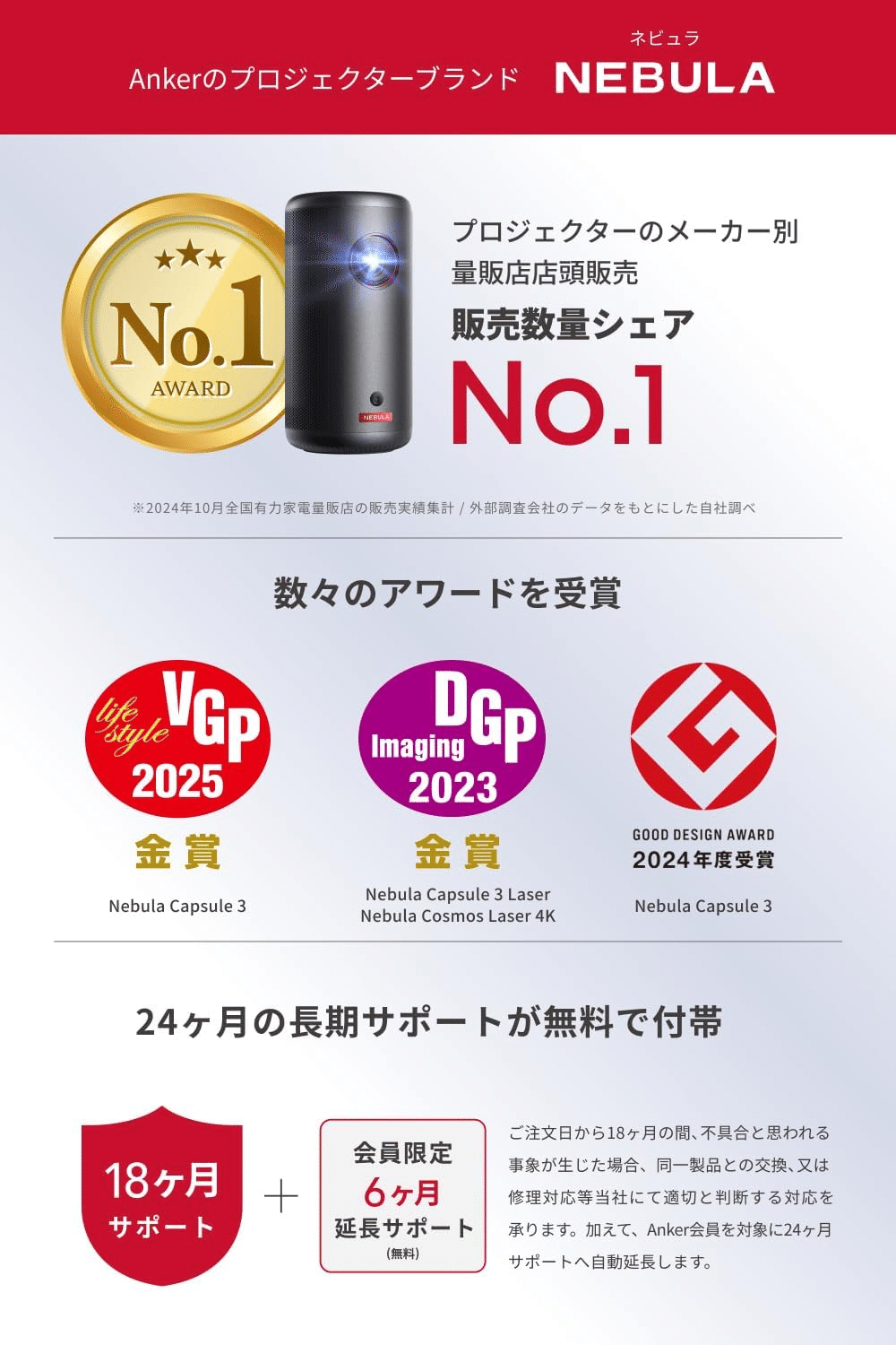 Anker Nebula Capsule 3 Laserは、コンパクトなデザインでありながら、フルHD画質と300ANSIルーメンの明るさで鮮明な映像を提供するモバイルプロジェクターです。Google TVを搭載し、Netflixにも正式対応しているため、ストリーミングが手軽に楽しめます。自動台形補正やオートフォーカス機能を備え、設置も簡単。天井投影でホームシアター体験を気軽に実現できます。8WのDolby Digitalスピーカーによる高音質と、2.5時間のバッテリー駆動で、室内外問わず活躍。持ち運びに便利な軽量設計で、映画やゲームを大画面で楽しみたい方に最適です。