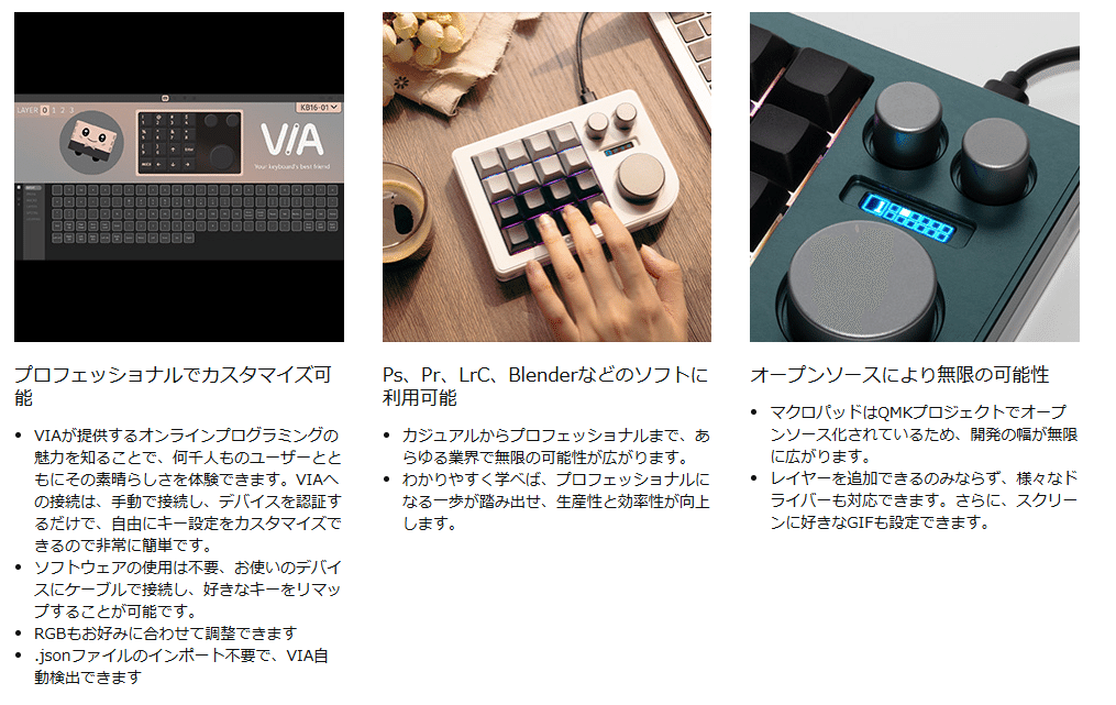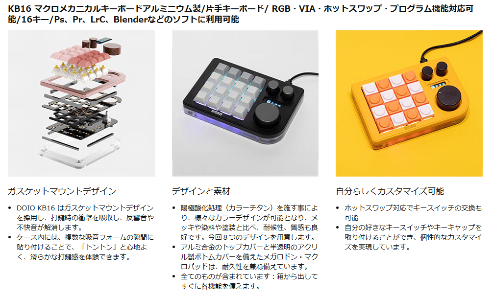 KB16はクリエイターやゲーマー向け片手キーボード。VIAでマクロを自由設定、PhotoshopやBlenderを効率化。アルミボディでコンパクト、RGBが映える!