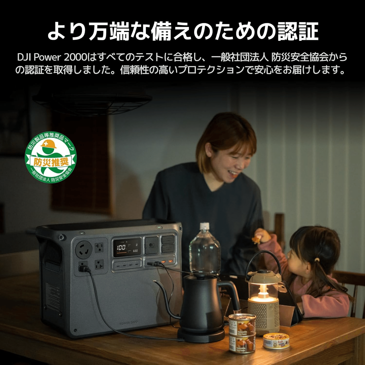 アウトドアや非常時に頼れる大容量ポータブル電源、DJI Power 2000をご紹介します。2048Whのリン酸鉄リチウムバッテリーを搭載し、2700Wの安定した高出力を実現。キャンプ、RV車中泊、停電対策など幅広いシーンで活躍します。わずか85分で80%充電可能な急速充電や、静音設計で快適な使用感を提供。DJI Homeアプリで遠隔操作もでき、使い勝手抜群です。コンパクトながら最大22.5kWhまで拡張可能な柔軟性も魅力。安全性を重視した設計で、安心して使える一台です。