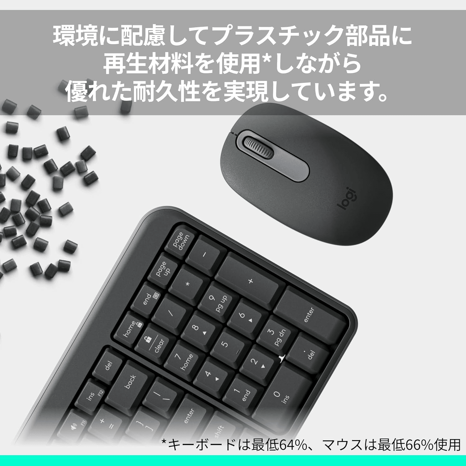 再生プラスチック: キーボード64%、マウス66%