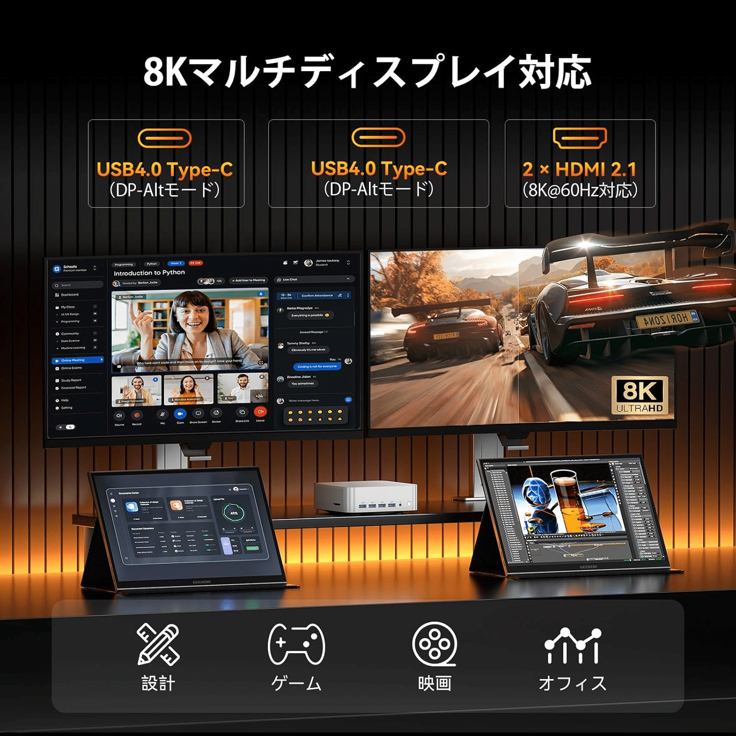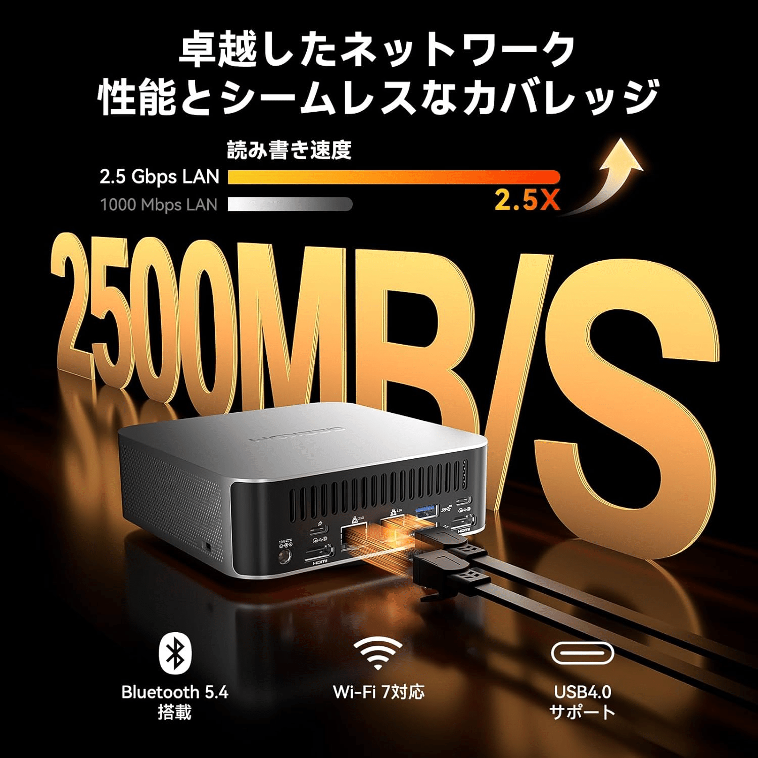 2025年に登場したGEEKOM A9 MAX AI ミニPCは、AMD Ryzen AI 9 HX 370を搭載し、AI処理能力が最大80TOPSに達する高性能モデルです。コンパクトなボディに128GBまで拡張可能なメモリと8TBのストレージを備え、4画面8K出力に対応。ゲーミングや動画編集、AI開発など幅広い用途で活躍します。全金属ボディによる高効率放熱と低騒音設計で、長時間の作業でも安定したパフォーマンスを発揮。Wi-Fi 7やデュアル2.5G LANで高速接続も実現し、業務用からエンタメまで理想的な一台です。