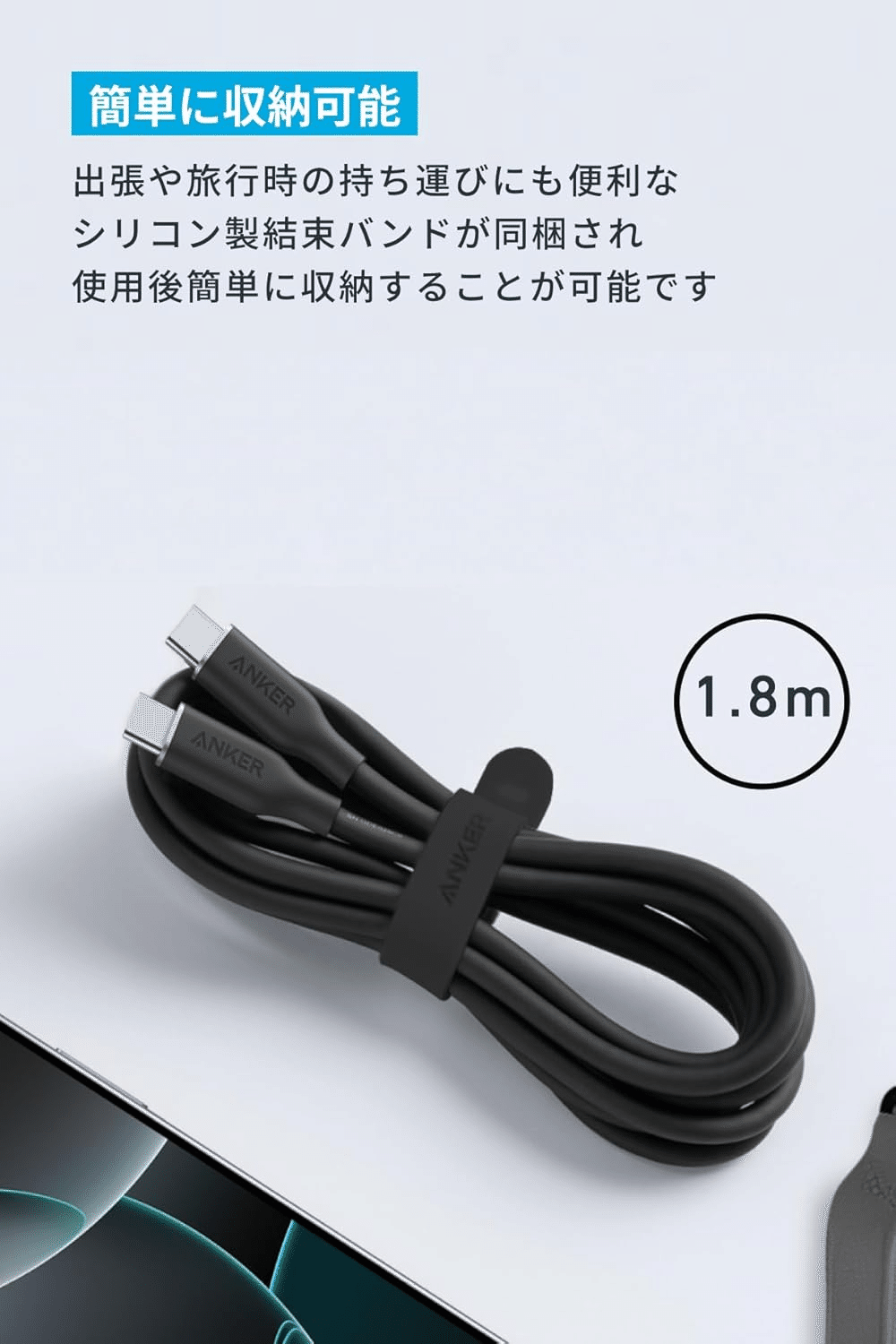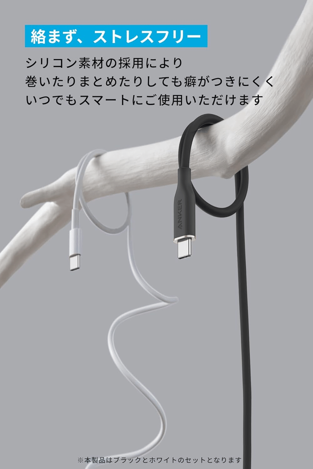 Anker PowerLine III Flow USB-C & USB-C ケーブル 1.8m 2本セット ブラック & ホワイトは、柔らかく絡まりにくいシリコン素材を採用した高耐久ケーブルです。最大240Wの急速充電に対応し、MacBookやiPhone、Androidデバイスなど幅広い機器で使用可能です。ブラックとホワイトの2色セットは、家庭やオフィスでの使い分けに便利。結束バンド付きで収納も簡単です。この記事では、仕様や実際の使用感、メリットを詳しく紹介します。