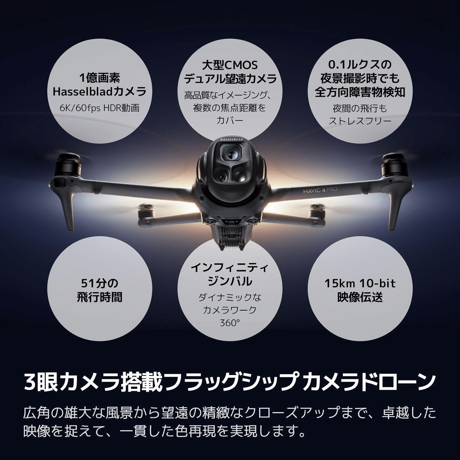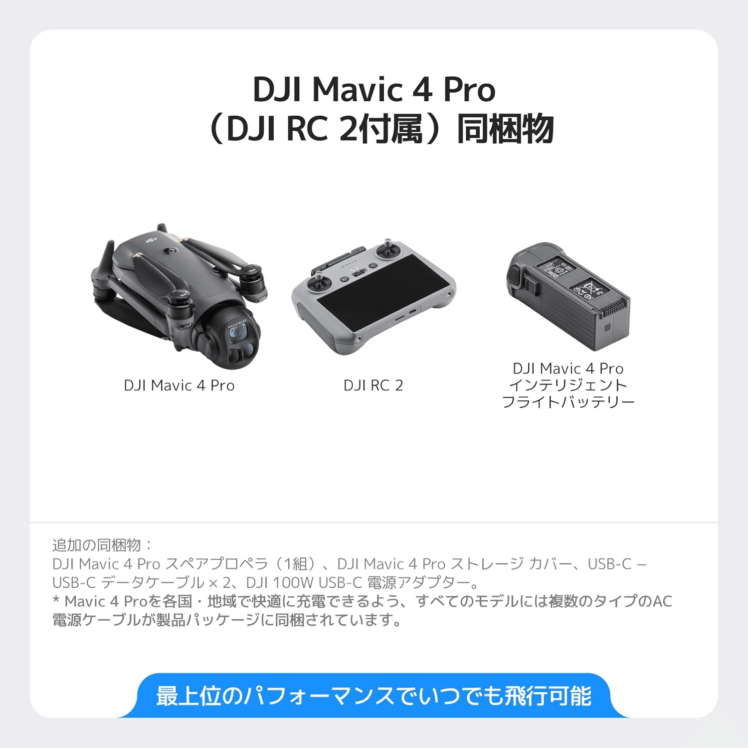 Title DJI Mavic 4 Pro ドローン(DJI RC 2付属) 1億画素超の4/3型CMOS Hasselbladカメラ搭載の3眼カメラドローン プロフェッショナル向けドローン 映像伝送距離15 km 最大51分飛行時間 バッテリー1個
