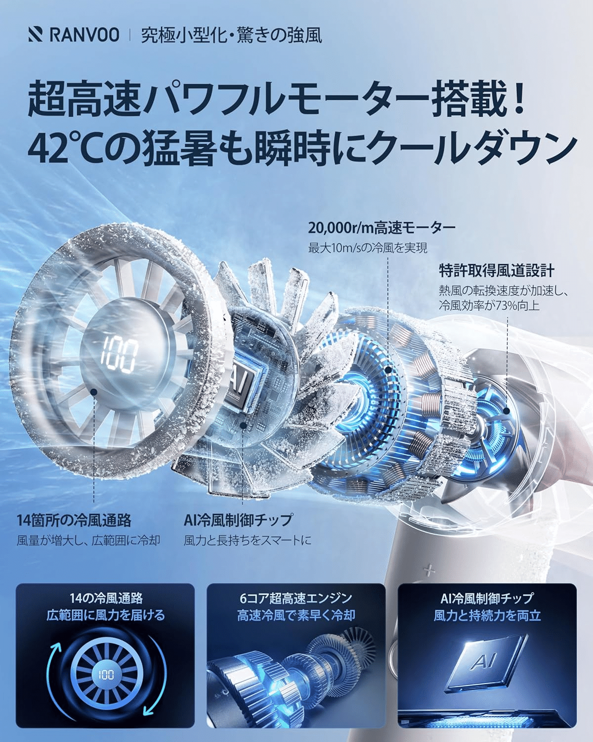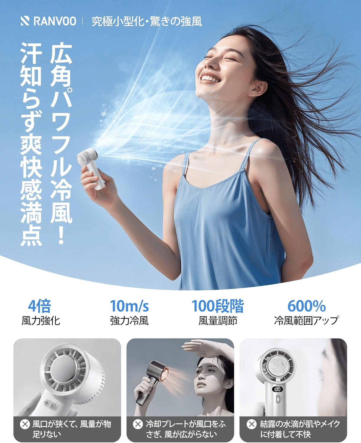 超高速パワフルモーター搭載! 42℃の猛暑も瞬時にクールダウン – RANVOO ハンディファン アイスブルー 超軽量強風